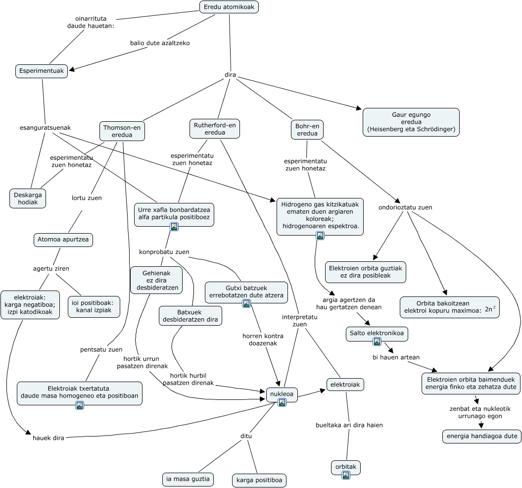 Este Cmap, tiene información relacionada con: Eredu Atomikoak, Eredu atomikoak dira Rutherford-en eredua, Elektroien orbita baimenduek energia finko eta zehatza dute zenbat eta nukleotik urrunago egon energia handiagoa dute, Gutxi batzuek errebotatzen dute atzera horren kontra doazenak nukleoa, Gehienak ez dira desbideratzen hortik urrun pasatzen direnak nukleoa, Bohr-en eredua ondorioztatu zuen Elektroien orbita guztiak ez dira posibleak, Atomoa apurtzea agertu ziren elektroiak: karga negatiboa; izpi katodikoak, Atomoa apurtzea agertu ziren ioi positiboak: kanal izpiak, elektroiak: karga negatiboa; izpi katodikoak hauek dira elektroiak, Eredu atomikoak oinarrituta daude hauetan: Esperimentuak, Hidrogeno gas kitzikatuak ematen duen argiaren koloreak; hidrogenoaren espektroa. argia agertzen da hau gertatzen denean Salto elektronikoa, nukleoa ditu ia masa guztia, Urre xafla bonbardatzea alfa partikula positiboez konprobatu zuen Gutxi batzuek errebotatzen dute atzera, Eredu atomikoak balio dute azaltzeko Esperimentuak, Esperimentuak esanguratsuenak Deskarga hodiak, Esperimentuak esanguratsuenak Hidrogeno gas kitzikatuak ematen duen argiaren koloreak; hidrogenoaren espektroa., Rutherford-en eredua interpretatu zuen elektroiak, Rutherford-en eredua interpretatu zuen nukleoa, elektroiak bueltaka ari dira haien orbitak, Bohr-en eredua esperimentatu zuen honetaz Hidrogeno gas kitzikatuak ematen duen argiaren koloreak; hidrogenoaren espektroa., Eredu atomikoak dira Bohr-en eredua