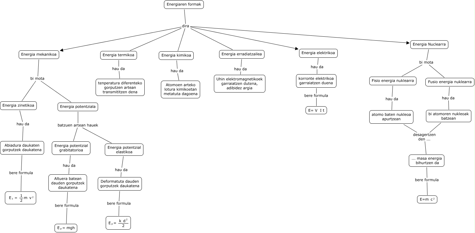 Este Cmap, tiene información relacionada con: Energia motak, bi atomoren nukleoak batzean desagertzen den ... ... masa energia bihurtzen da, Energia termikoa hau da tenperatura diferenteko gorputzen artean transmititzen dena, atomo baten nukleoa apurtzean desagertzen den ... ... masa energia bihurtzen da, Energiaren formak dira Energia termikoa, Energiaren formak dira Energia erradiatzailea, ... masa energia bihurtzen da bere formula <math xmlns="http://www.w3.org/1998/Math/MathML"> <mrow> <mtext> E=m </mtext> <mmultiscripts> <mtext> c </mtext> <none/> <mtext> 2 </mtext> </mmultiscripts> </mrow> </math>, korronte elektrikoa garraiatzen duena bere formula E= V I t, Energia potentzial elastikoa hau da Deformatuta dauden gorputzek daukatena, Energia potentziala batzuen artean hauek Energia potentzial elastikoa, Fusio energia nuklearra hau da bi atomoren nukleoak batzean, Deformatuta dauden gorputzek daukatena bere formula <math xmlns="http://www.w3.org/1998/Math/MathML"> <mrow> <mmultiscripts> <mtext> E </mtext> <mtext> p </mtext> <none/> </mmultiscripts> <mtext> = </mtext> <mfrac> <mrow> <mtext> k </mtext> <mmultiscripts> <mtext> d </mtext> <none/> <mtext> 2 </mtext> </mmultiscripts> </mrow> <mtext> 2 </mtext> </mfrac> </mrow> </math>, Energia mekanikoa bi mota Energia potentziala, Energiaren formak dira Energia kimikoa, Energiaren formak dira Energia elektrikoa, Energia potentziala batzuen artean hauek Energia potentzial grabitatorioa, Energia elektrikoa hau da korronte elektrikoa garraiatzen duena, Energia erradiatzailea hau da Uhin elektromagnetikoek garraiatzen dutena, adibidez argia, Energia Nuclearra bi mota Fisio energia nuklearra, Energiaren formak dira Energia mekanikoa, Energia kimikoa hau da Atomoen arteko lotura kimikoetan metatuta dagoena