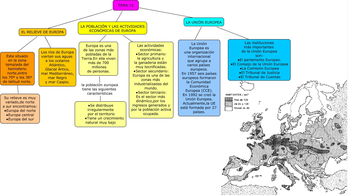 Este Cmap, tiene información relacionada con: tema 15 julia, LA POBLACIÓN Y LAS ACTIVIDADES ECONÓMICAS DE EUROPA ???? Europa es una de las zonas más pobladas de la Tierra.En ella viven más de 700 millones de personas., LA POBLACIÓN Y LAS ACTIVIDADES ECONÓMICAS DE EUROPA ???? Las actividades económicas: ∙Sector primario: la agricultura y la ganaderia están muy tecnificadas. ∙Sector secundario: Europa es una de las zonas más industrializadas del mundo. ∙Sector terciario: Es el sector más dinámico,por los ingresos generados y por la población activa ocupada., Esta situado en la zona templada del hemisferio norte,entre los 70º y los 36º de latitud norte. ???? Su relieve es muy variado,de norte a sur encontramos: ∙Europa del norte ∙Europa central ∙Europa del sur, LA UNIÓN EUROPEA ???? La Unión Europea es una organización internacional que agrupa a varios países europeos. En 1957 seis países europeos formaron la Comunidad Económica Europea (CCE). En 1992 se creó la Unión Europea. Actualmente,la UE está formada por 27 países., EL RELIEVE DE EUROPA ???? Esta situado en la zona templada del hemisferio norte,entre los 70º y los 36º de latitud norte., EL RELIEVE DE EUROPA ???? Los ríos de Europa vierten sus aguas a los océanos Atlántico, Glacial Ártico, mar Mediterráneo, mar Negro y mar Caspio., TEMA 15 ???? EL RELIEVE DE EUROPA, Europa es una de las zonas más pobladas de la Tierra.En ella viven más de 700 millones de personas. la población europea tiene las siguientes características ∙Se distribuye irregularmente por el territorio ∙Tiene un crecimiento natural muy bajo, TEMA 15 ???? LA POBLACIÓN Y LAS ACTIVIDADES ECONÓMICAS DE EUROPA, TEMA 15 ???? LA UNIÓN EUROPEA, LA UNIÓN EUROPEA ???? Las instituciones más importantes de la Unión Europea son: ∙El parlamento Europeo. ∙El Consejo de la Unión Europea ∙La Comisión Europea ∙El Tribunal de Justicia ∙El Tribunal de Cuentas