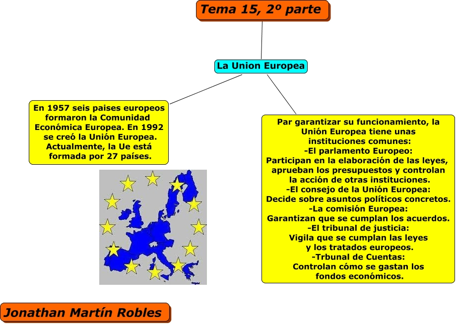 Este Cmap, tiene información relacionada con: Tema 15 de cono 2º parte de Jonathan, Tema 15, 2º parte La Union Europea Par garantizar su funcionamiento, la Unión Europea tiene unas instituciones comunes: -El parlamento Europeo: Participan en la elaboración de las leyes, aprueban los presupuestos y controlan la acción de otras instituciones. -El consejo de la Unión Europea: Decide sobre asuntos políticos concretos. -La comisión Europea: Garantizan que se cumplan los acuerdos. -El tribunal de justicia: Vigila que se cumplan las leyes y los tratados europeos. -Trbunal de Cuentas: Controlan cómo se gastan los fondos económicos., Tema 15, 2º parte La Union Europea En 1957 seis paises europeos formaron la Comunidad Económica Europea. En 1992 se creó la Unión Europea. Actualmente, la Ue está formada por 27 países.