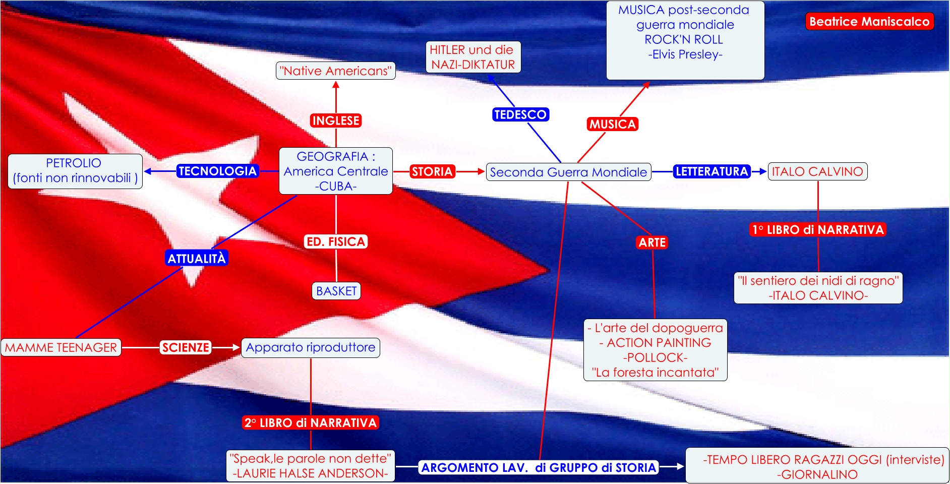 Questa Cmap, creata con IHMC CmapTools, contiene informazioni relative a: Progetto esame Bea, MAMME TEENAGER SCIENZE Apparato riproduttore, GEOGRAFIA : America Centrale -CUBA- STORIA Seconda Guerra Mondiale, GEOGRAFIA : America Centrale -CUBA- ATTUALITÀ MAMME TEENAGER, Seconda Guerra Mondiale ARGOMENTO LAV. di GRUPPO di STORIA -TEMPO LIBERO RAGAZZI OGGI (interviste) -GIORNALINO, Seconda Guerra Mondiale ARTE - L'arte del dopoguerra - ACTION PAINTING -POLLOCK- "La foresta incantata", Apparato riproduttore 2° LIBRO di NARRATIVA "Speak,le parole non dette" -LAURIE HALSE ANDERSON-, GEOGRAFIA : America Centrale -CUBA- ED. FISICA BASKET, "Speak,le parole non dette" -LAURIE HALSE ANDERSON- ARGOMENTO LAV. di GRUPPO di STORIA -TEMPO LIBERO RAGAZZI OGGI (interviste) -GIORNALINO, GEOGRAFIA : America Centrale -CUBA- TECNOLOGIA PETROLIO (fonti non rinnovabili ), Seconda Guerra Mondiale LETTERATURA ITALO CALVINO, Seconda Guerra Mondiale MUSICA MUSICA post-seconda guerra mondiale ROCK'N ROLL -Elvis Presley-, GEOGRAFIA : America Centrale -CUBA- INGLESE "Native Americans", Seconda Guerra Mondiale TEDESCO HITLER und die NAZI-DIKTATUR, ITALO CALVINO 1° LIBRO di NARRATIVA "Il sentiero dei nidi di ragno" -ITALO CALVINO-