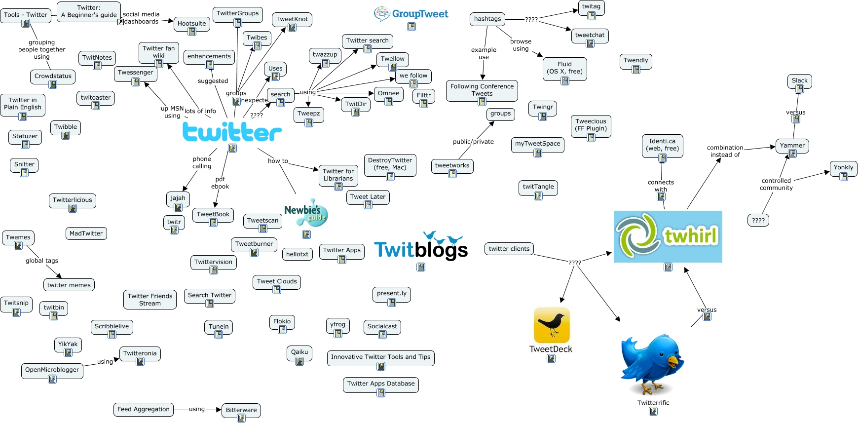 This Concept Map, created with IHMC CmapTools, has information related to: Microblogging, Twemes global tags twitter memes, suggested enhancements, search using Twitter search, twitter clients ????, Yammer versus Slack, twitter clients ???? Twitterrific, combination instead of Yammer, hashtags example use Following Conference Tweets, hashtags ???? tweetchat, Tools - Twitter social media dashboards Hootsuite, ???? search, groups Twibes, OpenMicroblogger using Twitteronia, search using TwitDir, Tools - Twitter grouping people together using Crowdstatus, ???? controlled community Yonkly, ???? controlled community Yammer, groups TwitterGroups, search using we follow, how to Twitter for Librarians
