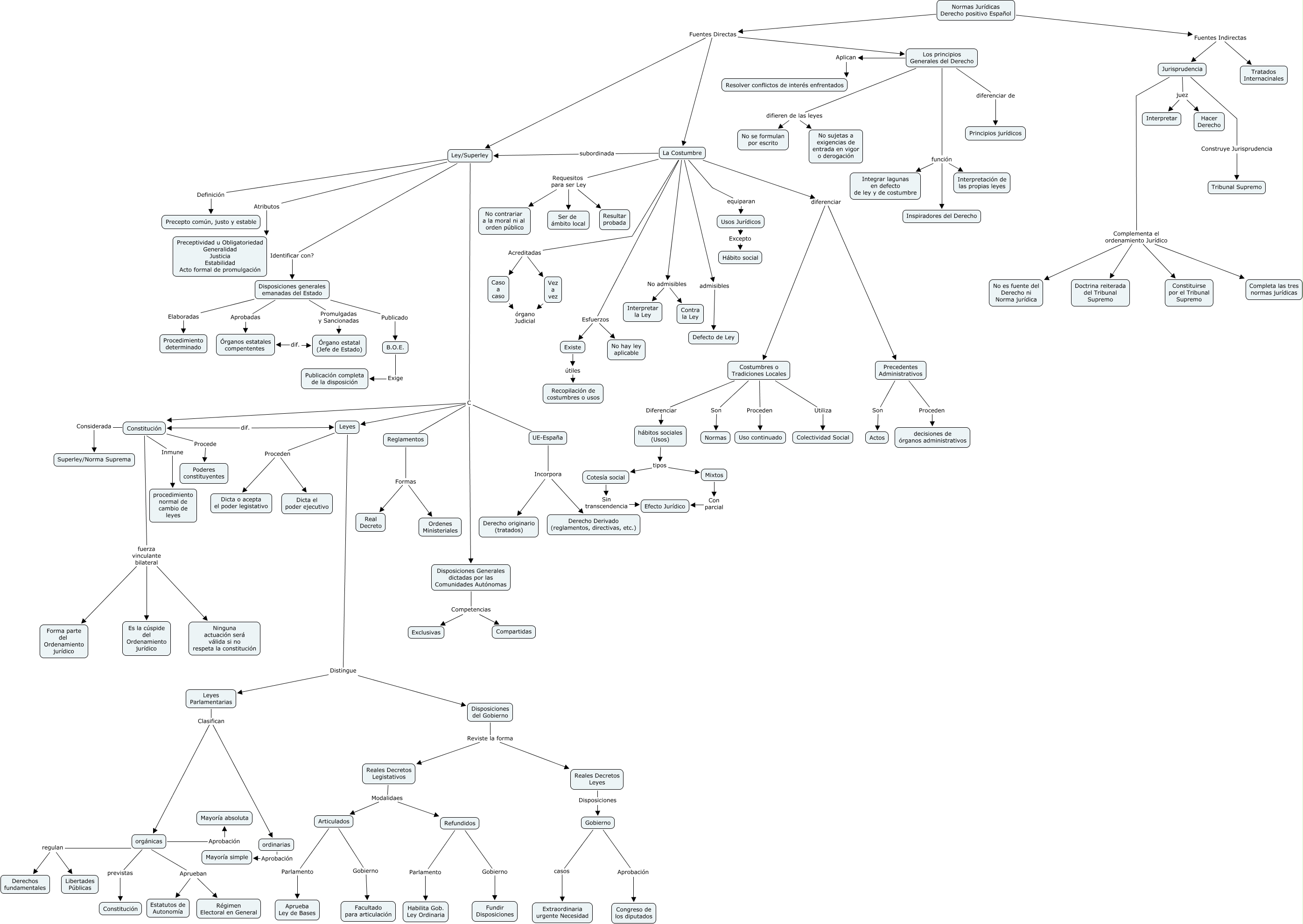 Este Cmap, tiene información relacionada con: AEC1 - Introducción Derecho (parte 1), Refundidos Gobierno Fundir Disposiciones, Constitución Considerada Superley/Norma Suprema, Disposiciones generales emanadas del Estado Promulgadas y Sancionadas Órgano estatal (Jefe de Estado), Reales Decretos Legistativos Modalidaes Refundidos, Los principios Generales del Derecho función Integrar lagunas en defecto de ley y de costumbre, orgánicas Aprueban Estatutos de Autonomía, Normas Jurídicas Derecho positivo Español Fuentes Directas Los principios Generales del Derecho, Constitución Inmune procedimiento normal de cambio de leyes, Constitución fuerza vinculante bilateral Forma parte del Ordenamiento jurídico, UE-España Incorpora Derecho Derivado (reglamentos, directivas, etc.), Leyes Parlamentarias Clasifican ordinarias, Normas Jurídicas Derecho positivo Español Fuentes Directas La Costumbre, Normas Jurídicas Derecho positivo Español Fuentes Directas Ley/Superley, Disposiciones generales emanadas del Estado Publicado B.O.E., La Costumbre diferenciar Precedentes Administrativos, Jurisprudencia Complementa el ordenamiento Jurídico Constituirse por el Tribunal Supremo, Reales Decretos Leyes Disposiciones Gobierno, La Costumbre Esfuerzos Existe, Constitución fuerza vinculante bilateral Ninguna actuación será válida si no respeta la constitución, Costumbres o Tradiciones Locales Diferenciar hábitos sociales (Usos)