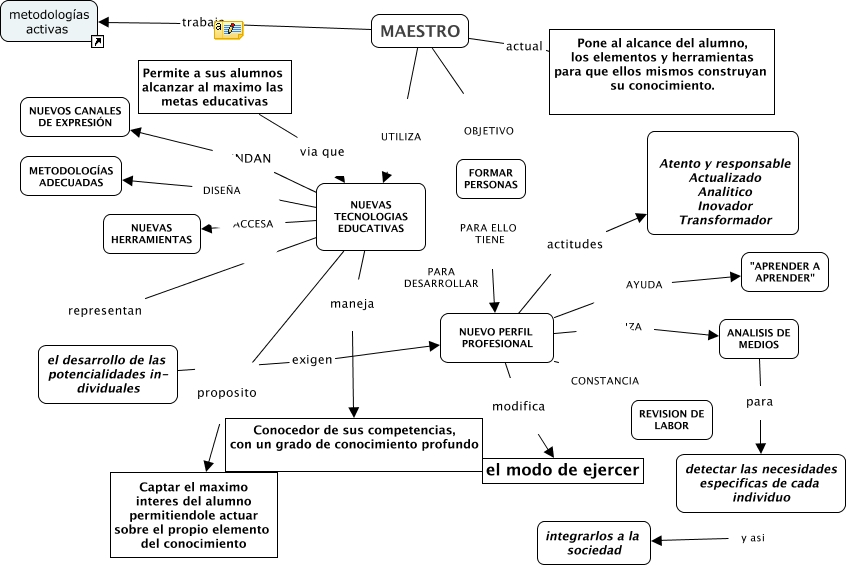 This Concept Map, created with IHMC CmapTools, has information related to: LIONARDOWE_producto8, NUEVAS TECNOLOGIAS EDUCATIVAS proposito Captar el maximo interes del alumno permitiendole actuar sobre el propio elemento del conocimiento, NUEVAS TECNOLOGIAS EDUCATIVAS ACCESA NUEVAS HERRAMIENTAS, NUEVAS TECNOLOGIAS EDUCATIVAS maneja Conocedor de sus competencias, con un grado de conocimiento profundo, NUEVO PERFIL PROFESIONAL actitudes Atento y responsable Actualizado Analitico Inovador Transformador, NUEVAS TECNOLOGIAS EDUCATIVAS representan el desarrollo de las potencialidades in- dividuales, ANALISIS DE MEDIOS para detectar las necesidades especificas de cada individuo, detectar las necesidades especificas de cada individuo y asi integrarlos a la sociedad, NUEVO PERFIL PROFESIONAL AYUDA "APRENDER A APRENDER", MAESTRO UTILIZA NUEVAS TECNOLOGIAS EDUCATIVAS, NUEVO PERFIL PROFESIONAL REALIZA ANALISIS DE MEDIOS, Permite a sus alumnos alcanzar al maximo las metas educativas via que NUEVAS TECNOLOGIAS EDUCATIVAS, MAESTRO trabaja metodologías activas, FORMAR PERSONAS PARA ELLO TIENE NUEVO PERFIL PROFESIONAL, NUEVO PERFIL PROFESIONAL modifica el modo de ejercer, el desarrollo de las potencialidades in- dividuales exigen NUEVO PERFIL PROFESIONAL, NUEVO PERFIL PROFESIONAL CONSTANCIA REVISION DE LABOR, MAESTRO OBJETIVO FORMAR PERSONAS, NUEVAS TECNOLOGIAS EDUCATIVAS PARA DESARROLLAR NUEVO PERFIL PROFESIONAL, MAESTRO actual Pone al alcance del alumno, los elementos y herramientas para que ellos mismos construyan su conocimiento., NUEVAS TECNOLOGIAS EDUCATIVAS DISEÑA METODOLOGÍAS ADECUADAS