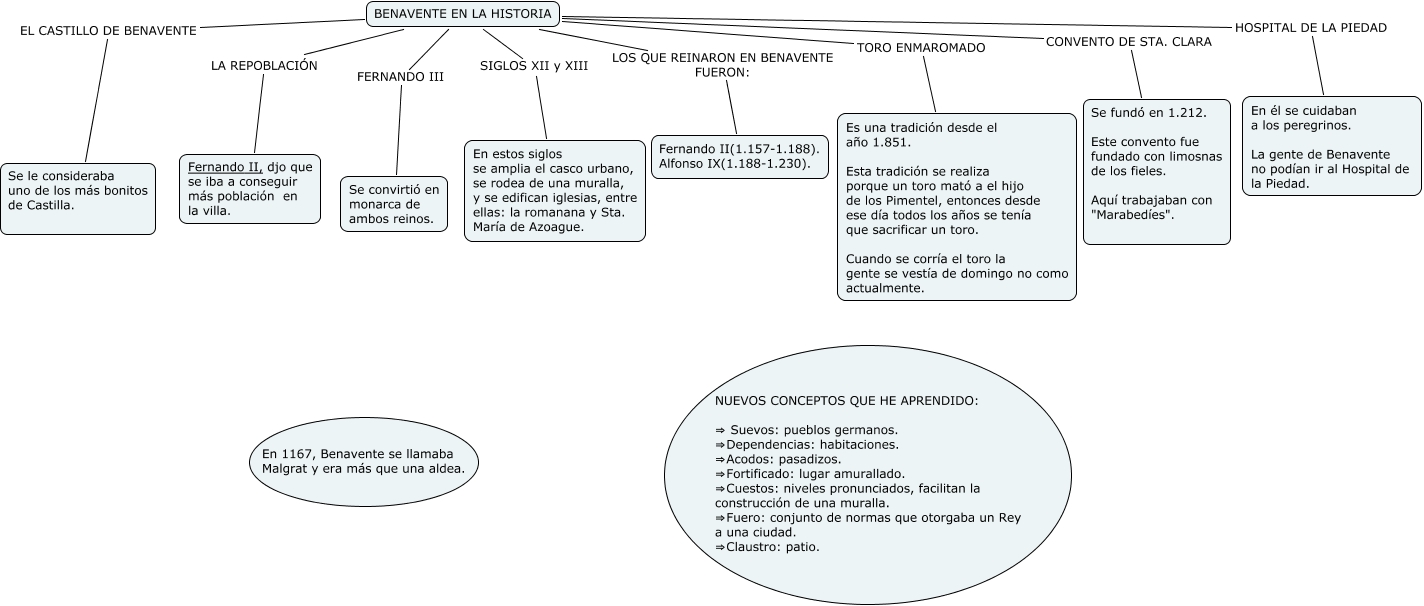 Este Cmap, tiene información relacionada con: Tema 16 de cono María Feliz, BENAVENTE EN LA HISTORIA LA REPOBLACIÓN Fernando II, djo que se iba a conseguir más población en la villa., BENAVENTE EN LA HISTORIA LOS QUE REINARON EN BENAVENTE FUERON: Fernando II(1.157-1.188). Alfonso IX(1.188-1.230)., BENAVENTE EN LA HISTORIA CONVENTO DE STA. CLARA Se fundó en 1.212. Este convento fue fundado con limosnas de los fieles. Aquí trabajaban con "Marabedíes"., BENAVENTE EN LA HISTORIA SIGLOS XII y XIII En estos siglos se amplia el casco urbano, se rodea de una muralla, y se edifican iglesias, entre ellas: la romanana y Sta. María de Azoague., BENAVENTE EN LA HISTORIA FERNANDO III Se convirtió en monarca de ambos reinos., BENAVENTE EN LA HISTORIA HOSPITAL DE LA PIEDAD En él se cuidaban a los peregrinos. La gente de Benavente no podían ir al Hospital de la Piedad., BENAVENTE EN LA HISTORIA EL CASTILLO DE BENAVENTE Se le consideraba uno de los más bonitos de Castilla., BENAVENTE EN LA HISTORIA TORO ENMAROMADO Es una tradición desde el año 1.851. Esta tradición se realiza porque un toro mató a el hijo de los Pimentel, entonces desde ese día todos los años se tenía que sacrificar un toro. Cuando se corría el toro la gente se vestía de domingo no como actualmente.