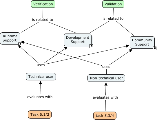 Este Cmap, tiene información relacionada con: Separation of concerns, Technical user uses Development Support, Non-technical user uses Runtime Support, task 5.3/4 evaluates with Non-technical user, Verification is related to Development Support, Task 5.1/2 evaluates with Technical user, Technical user uses Community Support, Technical user uses Runtime Support, Validation is related to Community Support, Validation is related to Development Support, Verification is related to Runtime Support, Non-technical user uses Community Support