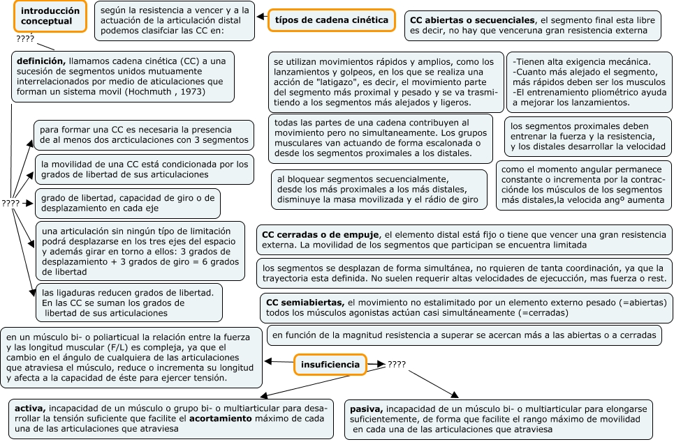 Este Cmap, tiene información relacionada con: aaTEMA 8, insuficiencia ???? pasiva, incapacidad de un músculo bi- o multiarticular para elongarse suficientemente, de forma que facilite el rango máximo de movilidad en cada una de las articulaciones que atraviesa, definición, llamamos cadena cinética (CC) a una sucesión de segmentos unidos mutuamente interrelacionados por medio de aticulaciones que forman un sistema movil (Hochmuth , 1973) ???? la movilidad de una CC está condicionada por los grados de libertad de sus articulaciones, introducción conceptual ???? definición, llamamos cadena cinética (CC) a una sucesión de segmentos unidos mutuamente interrelacionados por medio de aticulaciones que forman un sistema movil (Hochmuth , 1973), definición, llamamos cadena cinética (CC) a una sucesión de segmentos unidos mutuamente interrelacionados por medio de aticulaciones que forman un sistema movil (Hochmuth , 1973) ???? una articulación sin ningún típo de limitación podrá desplazarse en los tres ejes del espacio y además girar en torno a ellos: 3 grados de desplazamiento + 3 grados de giro = 6 grados de libertad, definición, llamamos cadena cinética (CC) a una sucesión de segmentos unidos mutuamente interrelacionados por medio de aticulaciones que forman un sistema movil (Hochmuth , 1973) ???? grado de libertad, capacidad de giro o de desplazamiento en cada eje, definición, llamamos cadena cinética (CC) a una sucesión de segmentos unidos mutuamente interrelacionados por medio de aticulaciones que forman un sistema movil (Hochmuth , 1973) ???? para formar una CC es necesaria la presencia de al menos dos arcticulaciones con 3 segmentos, definición, llamamos cadena cinética (CC) a una sucesión de segmentos unidos mutuamente interrelacionados por medio de aticulaciones que forman un sistema movil (Hochmuth , 1973) ???? las ligaduras reducen grados de libertad. En las CC se suman los grados de libertad de sus articulaciones, típos de cadena cinética ???? según la resistencia a vencer y a la actuación de la articulación distal podemos clasifciar las CC en:, insuficiencia ???? activa, incapacidad de un músculo o grupo bi- o multiarticular para desa- rrollar la tensión suficiente que facilite el acortamiento máximo de cada una de las articulaciones que atraviesa, insuficiencia ???? en un músculo bi- o poliarticual la relación entre la fuerza y las longitud muscular (F/L) es compleja, ya que el cambio en el ángulo de cualquiera de las articulaciones que atraviesa el músculo, reduce o incrementa su longitud y afecta a la capacidad de éste para ejercer tensión.