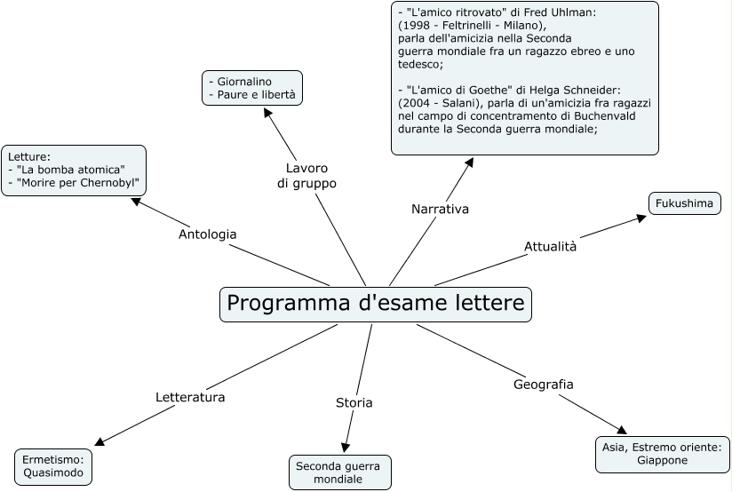 Questa Cmap, creata con IHMC CmapTools, contiene informazioni relative a: mappa guido lettere, Programma d'esame lettere Letteratura Ermetismo: Quasimodo, Programma d'esame lettere Narrativa - "L'amico ritrovato" di Fred Uhlman: (1998 - Feltrinelli - Milano), parla dell'amicizia nella Seconda guerra mondiale fra un ragazzo ebreo e uno tedesco; - "L'amico di Goethe" di Helga Schneider: (2004 - Salani), parla di un'amicizia fra ragazzi nel campo di concentramento di Buchenvald durante la Seconda guerra mondiale;, Programma d'esame lettere Storia Seconda guerra mondiale, Programma d'esame lettere Lavoro di gruppo - Giornalino - Paure e libertà, Programma d'esame lettere Geografia Asia, Estremo oriente: Giappone, Programma d'esame lettere Antologia Letture: - "La bomba atomica" - "Morire per Chernobyl", Programma d'esame lettere Attualità Fukushima