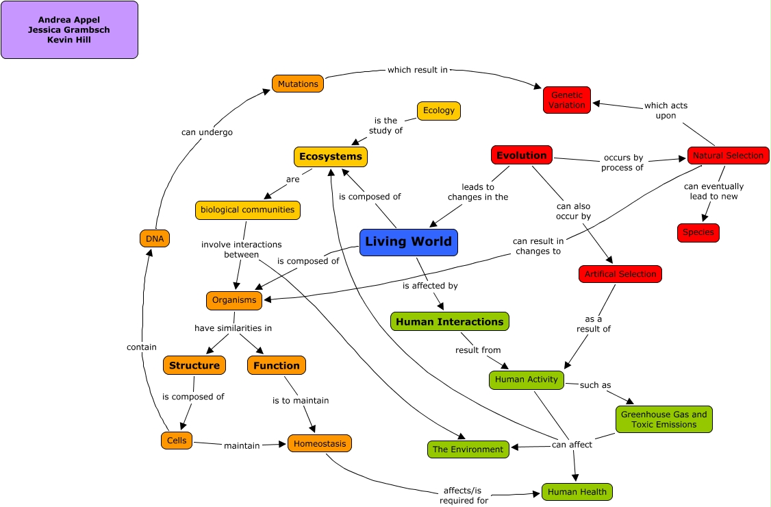 This Concept Map, created with IHMC CmapTools, has information related to: Living World, Greenhouse Gas and Toxic Emissions can affect Ecosystems, Ecology is the study of Ecosystems, Structure is composed of Cells, Organisms have similarities in Structure, Cells contain DNA, Human Activity can affect The Environment, Natural Selection can eventually lead to new Species, Human Activity can affect Human Health, Evolution leads to changes in the Living World, Organisms have similarities in Function, Evolution occurs by process of Natural Selection, Mutations which result in Genetic Variation, Human Activity can affect Ecosystems, Human Activity such as Greenhouse Gas and Toxic Emissions, Natural Selection can result in changes to Organisms, Greenhouse Gas and Toxic Emissions can affect The Environment, Homeostasis affects/is required for Human Health, Living World is composed of Ecosystems, Greenhouse Gas and Toxic Emissions can affect Human Health, Cells maintain Homeostasis