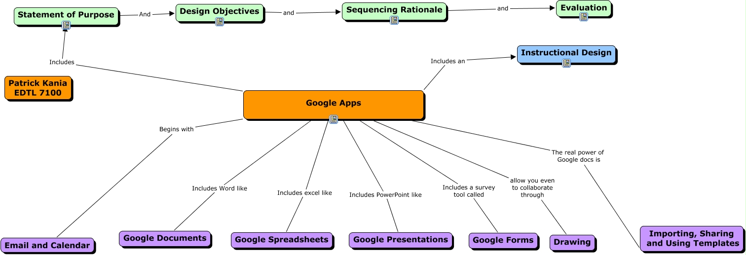 This Concept Map, created with IHMC CmapTools, has information related to: PKania Google Apps Cmap, Google Apps The real power of Google docs is Importing, Sharing and Using Templates, Google Apps Includes excel like Google Spreadsheets, Statement of Purpose And Design Objectives, Google Apps Includes an Instructional Design, Sequencing Rationale and Evaluation, Google Apps Includes Statement of Purpose, Design Objectives and Sequencing Rationale, Google Apps allow you even to collaborate through Drawing, Google Apps Includes PowerPoint like Google Presentations, Google Apps Includes a survey tool called Google Forms, Google Apps Includes Word like Google Documents, Google Apps Begins with Email and Calendar
