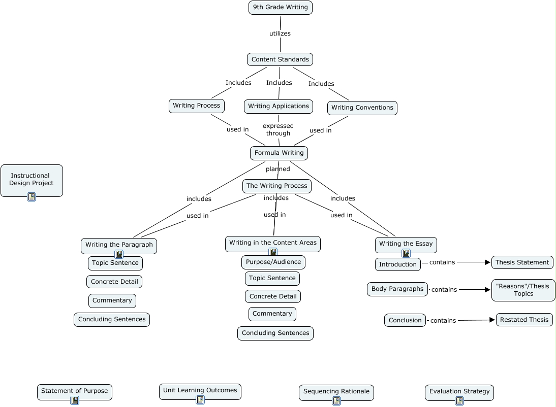 This Concept Map, created with IHMC CmapTools, has information related to: Monica Asher Formula Writing Instructional Design, Writing Applications expressed through Formula Writing, Conclusion contains Restated Thesis, Content Standards Includes Writing Applications, Formula Writing includes Writing in the Content Areas, Introduction contains Thesis Statement, Formula Writing includes Writing the Essay, Writing Conventions used in Formula Writing, 9th Grade Writing utilizes Content Standards, Formula Writing planned The Writing Process, Content Standards Includes Writing Process, 9th Grade Writing Content Standards, Writing Process used in Formula Writing, Body Paragraphs contains "Reasons"/Thesis Topics, The Writing Process used in Writing the Paragraph, Content Standards Includes Writing Conventions, The Writing Process used in Writing in the Content Areas, Formula Writing includes Writing the Paragraph, The Writing Process used in Writing the Essay