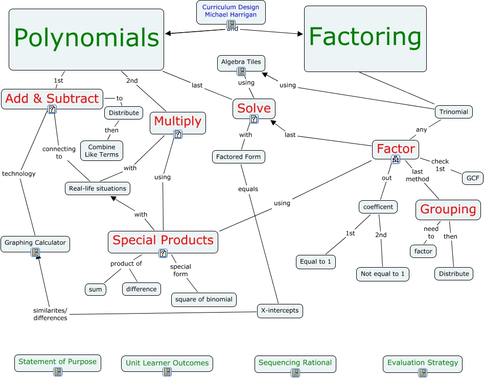 This Concept Map, created with IHMC CmapTools, has information related to: HarriganInstructionalDesignUnitonPolynomials, Factor check 1st GCF, coefficent 2nd Not equal to 1, Polynomials last Solve, Multiply with Real-life situations, Grouping need to factor, Trinomial any Factor, Solve with Factored Form, Polynomials 2nd Multiply, Trinomial using Algebra Tiles, Grouping then Distribute, Special Products special form square of binomial, Polynomials and Factoring, Special Products with Real-life situations, Factoring ???? Trinomial, Factor out coefficent, X-intercepts similarites/ differences Graphing Calculator, Special Products product of difference, Factor last method Grouping, Factor last Solve, coefficent 1st Equal to 1