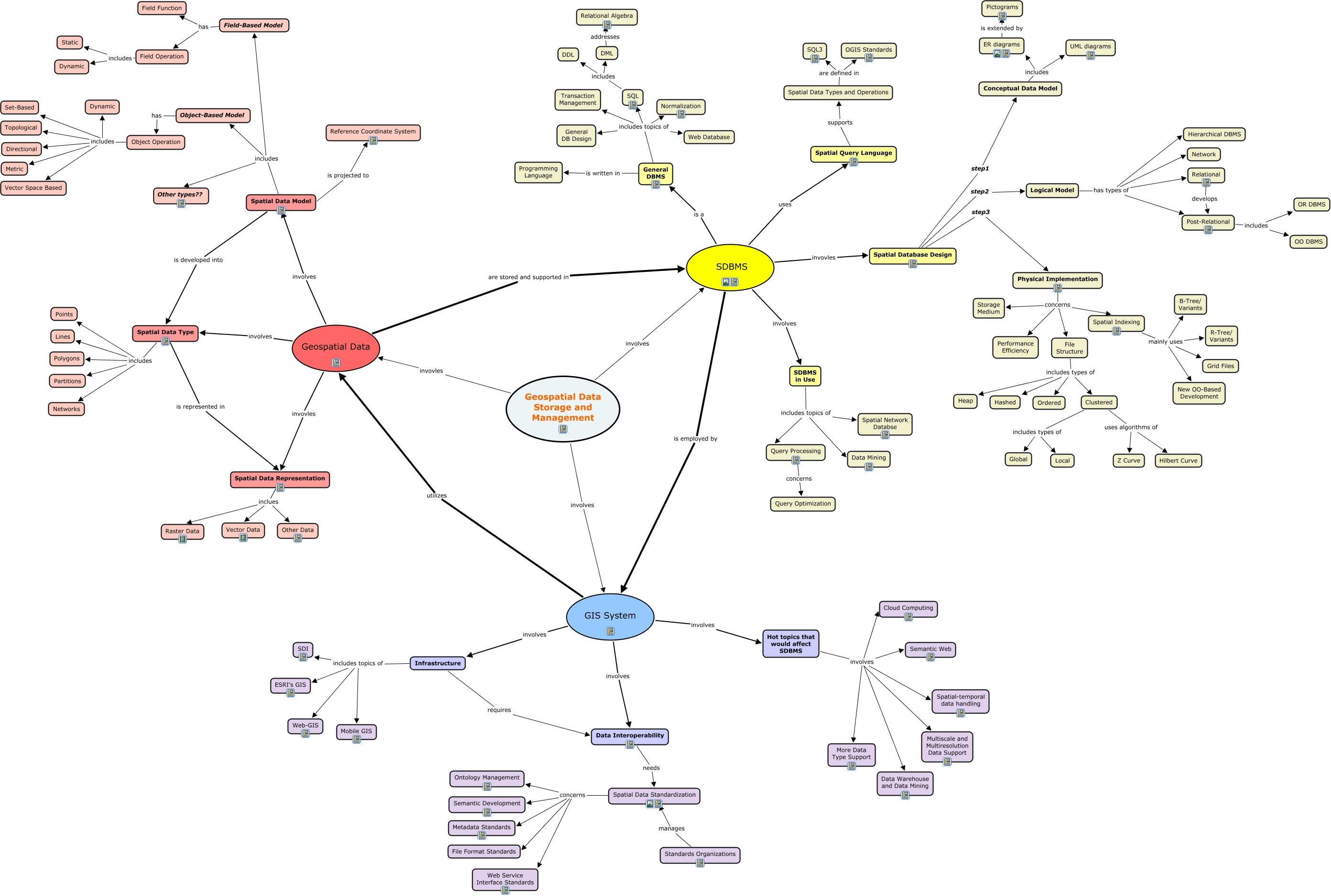 This Concept Map, created with IHMC CmapTools, has information related to: Geospatial Data Storage and Management, DML addresses Relational Algebra, SDBMS involves SDBMS in Use, SDBMS invovles Spatial Database Design, Spatial Data Model is projected to Reference Coordinate System, Clustered includes types of Global, Spatial Data Type includes Points, GIS System involves Infrastructure, SQL includes DML, Geospatial Data Storage and Management involves SDBMS, Field-Based Model has Field Function, Infrastructure requires Data Interoperability, Logical Model has types of Post-Relational, Logical Model has types of Hierarchical DBMS, Spatial Database Design step3 Physical Implementation, Spatial Indexing mainly uses B-Tree/ Variants, Geospatial Data involves Spatial Data Type, General DBMS includes topics of SQL, Clustered uses algorithms of Hilbert Curve, Clustered uses algorithms of Z Curve, File Structure includes types of Ordered