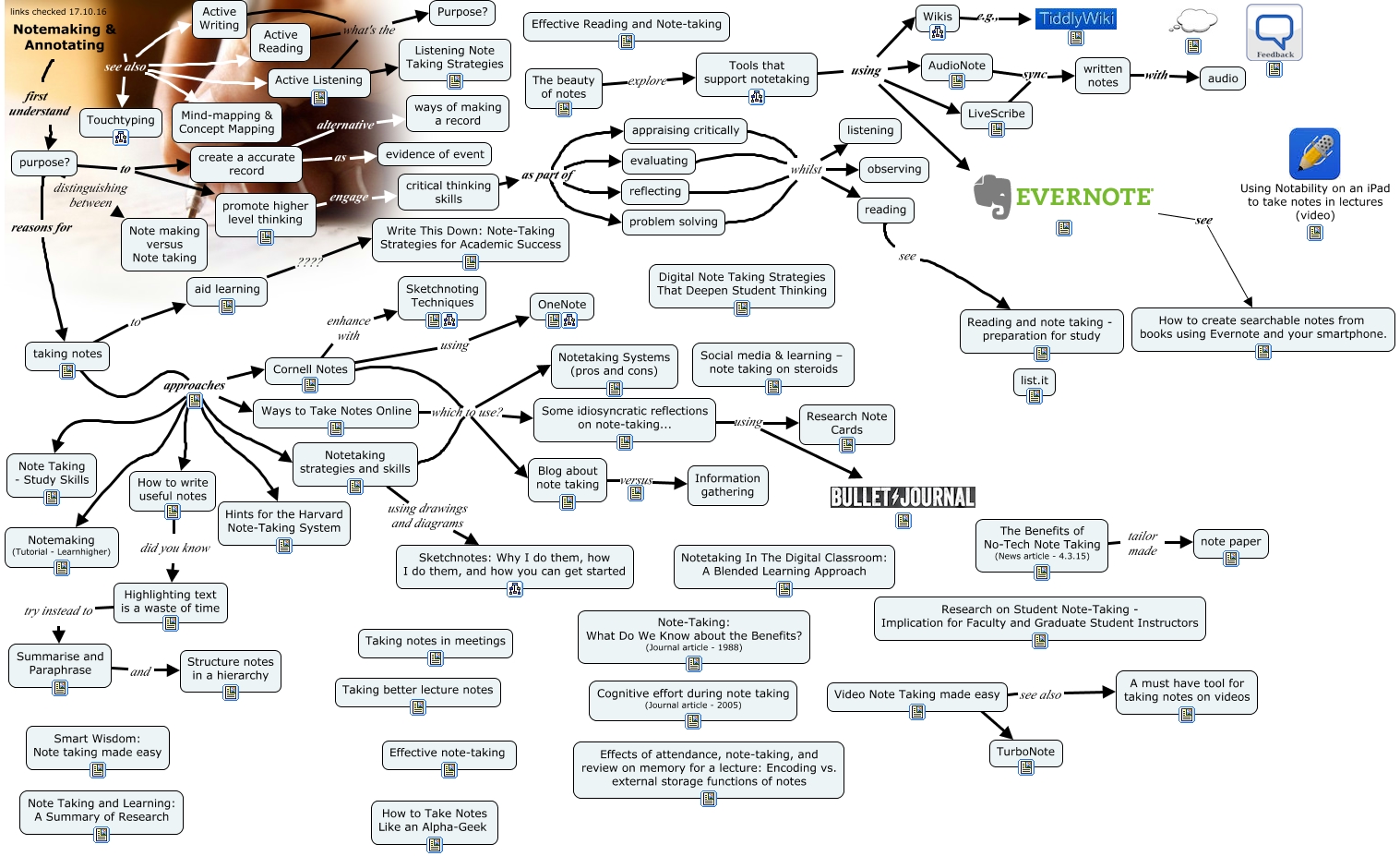This Concept Map, created with IHMC CmapTools, has information related to: Notemaking and Annotating, purpose? to create a accurate record, Notemaking & Annotating see also Active Reading, How to write useful notes did you know Highlighting text is a waste of time, critical thinking skills as part of reflecting, create a accurate record as evidence of event, reading see Reading and note taking - preparation for study, reflecting whilst listening, Active Reading what's the Purpose?, purpose? reasons for taking notes, evaluating whilst listening, promote higher level thinking engage critical thinking skills, appraising critically whilst reading, appraising critically whilst listening, LiveScribe sync written notes, Notemaking & Annotating see also Mind-mapping & Concept Mapping, Wikis e.g.,, Cornell Notes which to use? Notetaking Systems (pros and cons), Notetaking strategies and skills using drawings and diagrams Sketchnotes: Why I do them, how I do them, and how you can get started, Some idiosyncratic reflections on note-taking... using, taking notes to aid learning