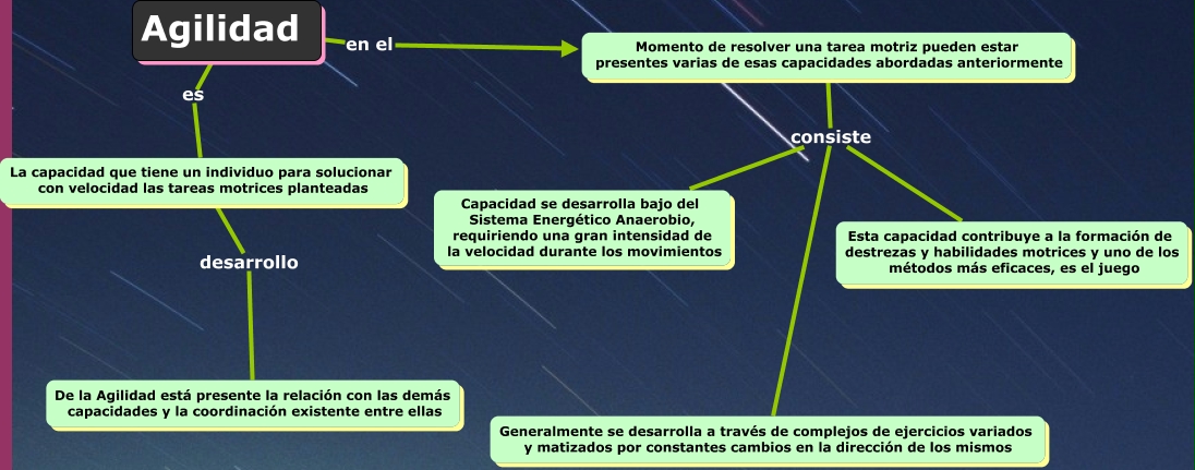 Este Cmap, tiene información relacionada con: agilidad, Momento de resolver una tarea motriz pueden estar presentes varias de esas capacidades abordadas anteriormente consiste Generalmente se desarrolla a través de complejos de ejercicios variados y matizados por constantes cambios en la dirección de los mismos, Momento de resolver una tarea motriz pueden estar presentes varias de esas capacidades abordadas anteriormente consiste Esta capacidad contribuye a la formación de destrezas y habilidades motrices y uno de los métodos más eficaces, es el juego, Agilidad en el Momento de resolver una tarea motriz pueden estar presentes varias de esas capacidades abordadas anteriormente, La capacidad que tiene un individuo para solucionar con velocidad las tareas motrices planteadas desarrollo De la Agilidad está presente la relación con las demás capacidades y la coordinación existente entre ellas, Agilidad es La capacidad que tiene un individuo para solucionar con velocidad las tareas motrices planteadas, Momento de resolver una tarea motriz pueden estar presentes varias de esas capacidades abordadas anteriormente consiste Capacidad se desarrolla bajo del Sistema Energético Anaerobio, requiriendo una gran intensidad de la velocidad durante los movimientos