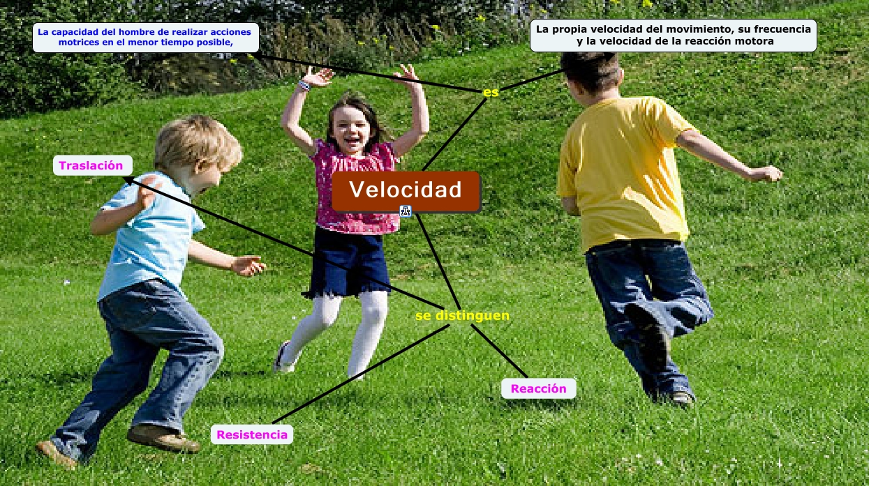 Este Cmap, tiene información relacionada con: Velocidad, Velocidad se distinguen Traslación, Velocidad se distinguen Resistencia, Velocidad es La propia velocidad del movimiento, su frecuencia y la velocidad de la reacción motora, Velocidad es La capacidad del hombre de realizar acciones motrices en el menor tiempo posible,, Velocidad se distinguen Reacción