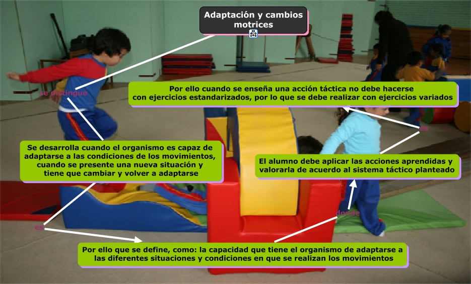 Este Cmap, tiene información relacionada con: adapotación y ca, Por ello que se define, como: la capacidad que tiene el organismo de adaptarse a las diferentes situaciones y condiciones en que se realizan los movimientos donde El alumno debe aplicar las acciones aprendidas y valorarla de acuerdo al sistema táctico planteado, El alumno debe aplicar las acciones aprendidas y valorarla de acuerdo al sistema táctico planteado es Por ello cuando se enseña una acción táctica no debe hacerse con ejercicios estandarizados, por lo que se debe realizar con ejercicios variados, Adaptación y cambios motrices se distingue Se desarrolla cuando el organismo es capaz de adaptarse a las condiciones de los movimientos, cuando se presente una nueva situación y tiene que cambiar y volver a adaptarse, Se desarrolla cuando el organismo es capaz de adaptarse a las condiciones de los movimientos, cuando se presente una nueva situación y tiene que cambiar y volver a adaptarse es Por ello que se define, como: la capacidad que tiene el organismo de adaptarse a las diferentes situaciones y condiciones en que se realizan los movimientos