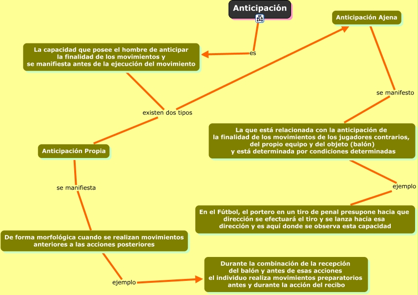 Este Cmap, tiene información relacionada con: anticipación, La capacidad que posee el hombre de anticipar la finalidad de los movimientos y se manifiesta antes de la ejecución del movimiento existen dos tipos Anticipación Ajena, De forma morfológica cuando se realizan movimientos anteriores a las acciones posteriores ejemplo Durante la combinación de la recepción del balón y antes de esas acciones el individuo realiza movimientos preparatorios antes y durante la acción del recibo, Anticipación Ajena se manifesto La que está relacionada con la anticipación de la finalidad de los movimientos de los jugadores contrarios, del propio equipo y del objeto (balón) y está determinada por condiciones determinadas, La que está relacionada con la anticipación de la finalidad de los movimientos de los jugadores contrarios, del propio equipo y del objeto (balón) y está determinada por condiciones determinadas ejemplo En el Fútbol, el portero en un tiro de penal presupone hacia que dirección se efectuará el tiro y se lanza hacia esa dirección y es aquí donde se observa esta capacidad, Anticipación es La capacidad que posee el hombre de anticipar la finalidad de los movimientos y se manifiesta antes de la ejecución del movimiento, La capacidad que posee el hombre de anticipar la finalidad de los movimientos y se manifiesta antes de la ejecución del movimiento existen dos tipos Anticipación Propia, Anticipación Propia se manifiesta De forma morfológica cuando se realizan movimientos anteriores a las acciones posteriores
