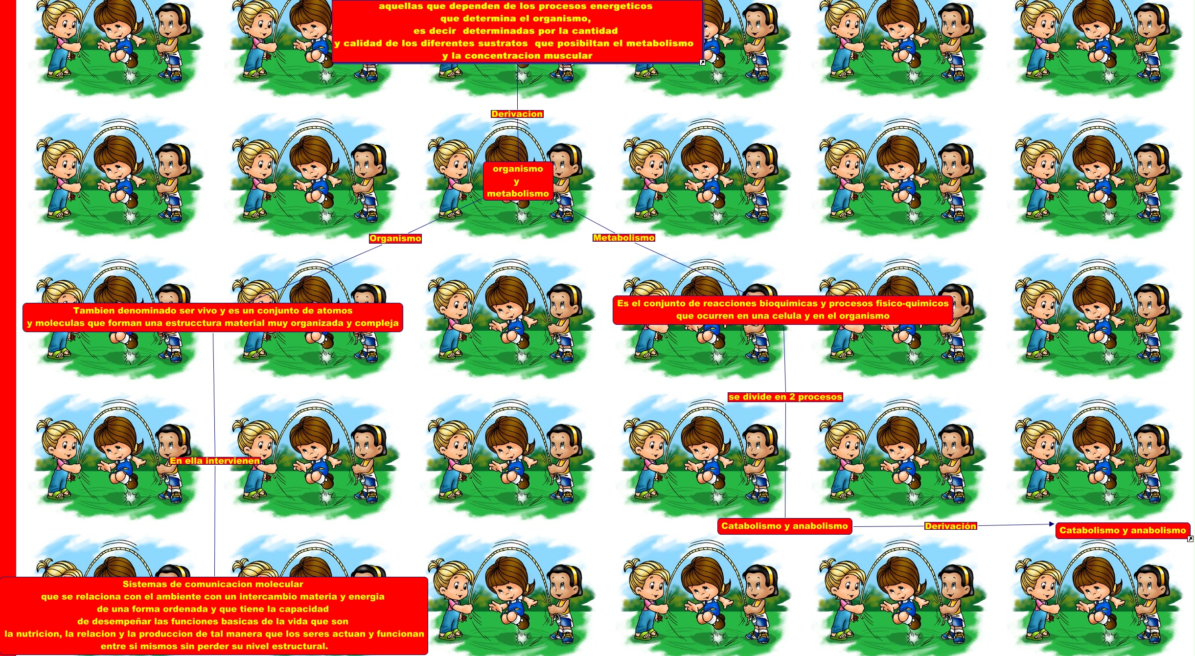 Este Cmap, tiene información relacionada con: hiper de organismo y metabolismo, organismo y metabolismo Organismo Tambien denominado ser vivo y es un conjunto de atomos y moleculas que forman una estrucctura material muy organizada y compleja, organismo y metabolismo Metabolismo Es el conjunto de reacciones bioquimicas y procesos fisico-quimicos que ocurren en una celula y en el organismo, Catabolismo y anabolismo Derivación Catabolismo y anabolismo, Tambien denominado ser vivo y es un conjunto de atomos y moleculas que forman una estrucctura material muy organizada y compleja En ella intervienen Sistemas de comunicacion molecular que se relaciona con el ambiente con un intercambio materia y energia de una forma ordenada y que tiene la capacidad de desempeñar las funciones basicas de la vida que son la nutricion, la relacion y la produccion de tal manera que los seres actuan y funcionan entre si mismos sin perder su nivel estructural., aquellas que dependen de los procesos energeticos que determina el organismo, es decir determinadas por la cantidad y calidad de los diferentes sustratos que posibiltan el metabolismo y la concentracion muscular Derivacion organismo y metabolismo, Es el conjunto de reacciones bioquimicas y procesos fisico-quimicos que ocurren en una celula y en el organismo se divide en 2 procesos Catabolismo y anabolismo