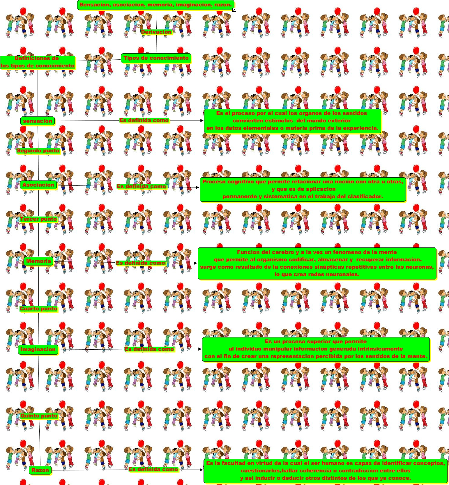 Este Cmap, tiene información relacionada con: hiper del hiper 2 de inteligencia operativa tipos de conocimiento, Imaginacion Quinto punto Razon, Memoria Cuarto punto Imaginacion, Razon Es definida como Es la facultad en virtud de la cual el ser humano es capaz de identificar conceptos, cuestionarlos,hallar coherencia o contradiccion entre ellos y asi inducir o deducir otros distintos de los que ya conoce., Asociacion Tercer punto Memoria, Asociacion Es definida como Proceso cognitivo que permite relacionar una nocion con otra u otras, y que es de aplicacion permanente y sistematica en el trabajo del clasificador., Sensacion, asociacion, memoria, imaginacion, razon. Derivación Tipos de conocimiento, sensación Es definida como Es el proceso por el cual los organos de los sentidos convierten estimulos del mundo exterior en los datos elementales o materia prima de la experiencia., Memoria Es definida como Funcion del cerebro y a la vez un fenomeno de la mente que permite al organismo codificar, almacenar y recuperar informacion. surge como resultado de la conexiones sinápticas repetitivas entre las neuronas, lo que crea redes neuronales., Imaginacion Es definida como Es un proceso superior que permite al individuo manipular informacion generada intrinsicamente con el fin de crear una representacion percibida por los sentidos de la mente., Tipos de conocimiento Definiciones de los tipos de conocimiento sensación, sensación Segundo punto Asociacion