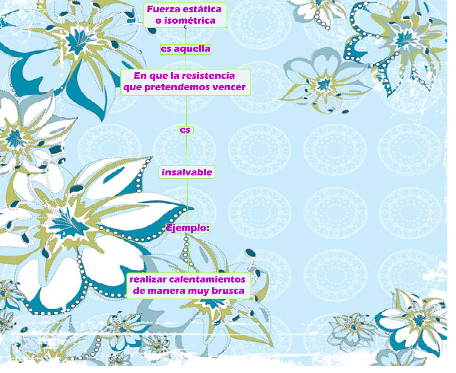 Este Cmap, tiene información relacionada con: Fuerza estatica o isometrica, Fuerza estática o isométrica es aquella En que la resistencia que pretendemos vencer, insalvable Ejemplo: realizar calentamientos de manera muy brusca, En que la resistencia que pretendemos vencer es insalvable