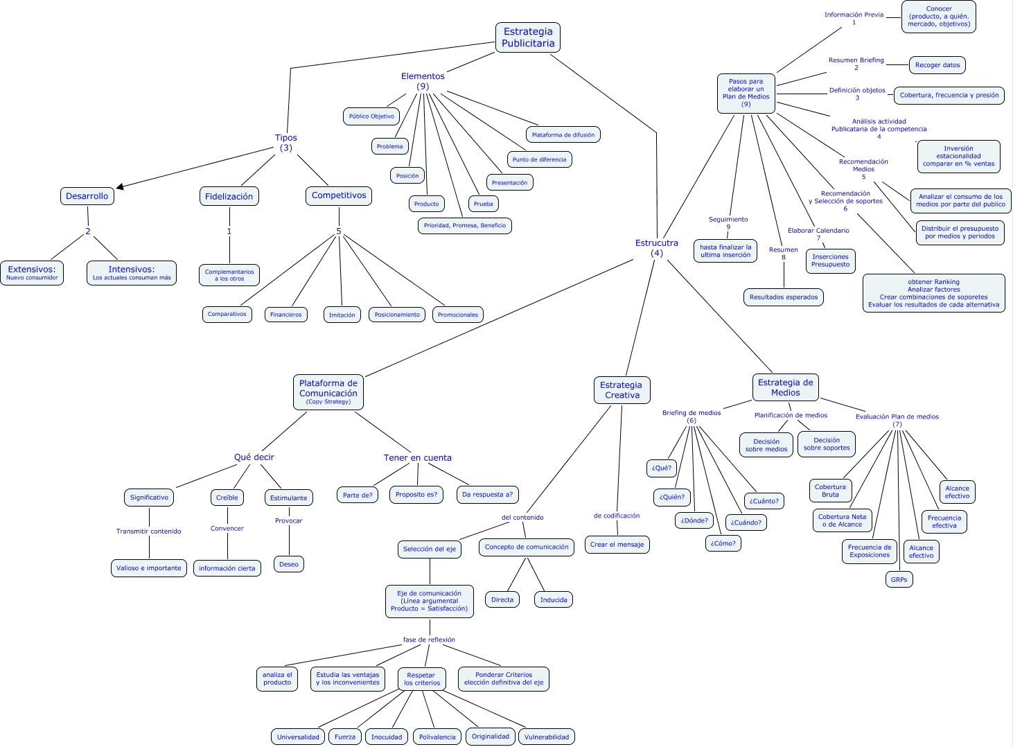 Este Cmap, tiene información relacionada con: Estrategia Publicitaria, Estrategia Publicitaria Elementos (9) Problema, Competitivos 5 Financieros, Respetar los criterios ???? Inocuidad, Estrategia de Medios Evaluación Plan de medios (7) Cobertura Bruta, Pasos para elaborar un Plan de Medios (9) Recomendación Medios 5 Analizar el consumo de los medios por parte del publico, Pasos para elaborar un Plan de Medios (9) Resumen 8 Resultados esperados, Pasos para elaborar un Plan de Medios (9) Resumen Briefing 2 Recoger datos, Desarrollo 2 Extensivos: Nuevo consumidor, Eje de comunicación (Línea argumental Producto = Satisfacción) fase de reflexión Respetar los criterios, Estrategia Publicitaria Elementos (9) Plataforma de difusión, Estrategia Publicitaria Estrucutra (4) Plataforma de Comunicación (Copy Strategy), Selección del eje ???? Eje de comunicación (Línea argumental Producto = Satisfacción), Pasos para elaborar un Plan de Medios (9) Análisis actividad Publicataria de la competencia 4 Inversión estacionalidad comparar en % ventas, Estrategia Publicitaria Estrucutra (4) Pasos para elaborar un Plan de Medios (9), Estrategia Publicitaria Elementos (9) Público Objetivo, Concepto de comunicación ???? Inducida, Estrategia de Medios Evaluación Plan de medios (7) GRPs, Creíble Convencer información cierta, Plataforma de Comunicación (Copy Strategy) Tener en cuenta Da respuesta a?, Estrategia de Medios Briefing de medios (6) ¿Cómo?