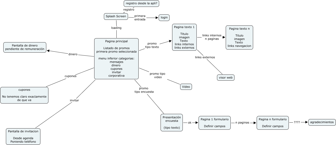 Este Cmap, tiene información relacionada con: oneBusy, Splash Screen primera entrada login, Pagina texto 1 Titulo imagen Texto links internos links externos links externos visor web, Pagina n formulario Definir campos ???? agradecimientos, Pagina principal Listado de promos primera promo seleccionada menu inferior categorias: mensajes dinero cupones invitar corporativa promo tipo texto Pagina texto 1 Titulo imagen Texto links internos links externos, Pagina principal Listado de promos primera promo seleccionada menu inferior categorias: mensajes dinero cupones invitar corporativa cupones cupones No tenemos claro exactamente de que va, Splash Screen loading Pagina principal Listado de promos primera promo seleccionada menu inferior categorias: mensajes dinero cupones invitar corporativa, Pagina 1 formulario Definir campos n paginas Pagina n formulario Definir campos, Splash Screen registro registro desde la apli?, Pagina principal Listado de promos primera promo seleccionada menu inferior categorias: mensajes dinero cupones invitar corporativa promo tipo encuesta Presentación encuesta (tipo texto), Presentación encuesta (tipo texto) ok Pagina 1 formulario Definir campos, Pagina texto 1 Titulo imagen Texto links internos links externos links internos n paginas Pagina texto n Titulo imagen Texto links navegacion, Pagina principal Listado de promos primera promo seleccionada menu inferior categorias: mensajes dinero cupones invitar corporativa invitar Pantalla de invitacion Desde agenda Poniendo teléfono, Pagina principal Listado de promos primera promo seleccionada menu inferior categorias: mensajes dinero cupones invitar corporativa dinero Pantalla de dinero pendiente de remuneración, Pagina principal Listado de promos primera promo seleccionada menu inferior categorias: mensajes dinero cupones invitar corporativa promo tipo video Video