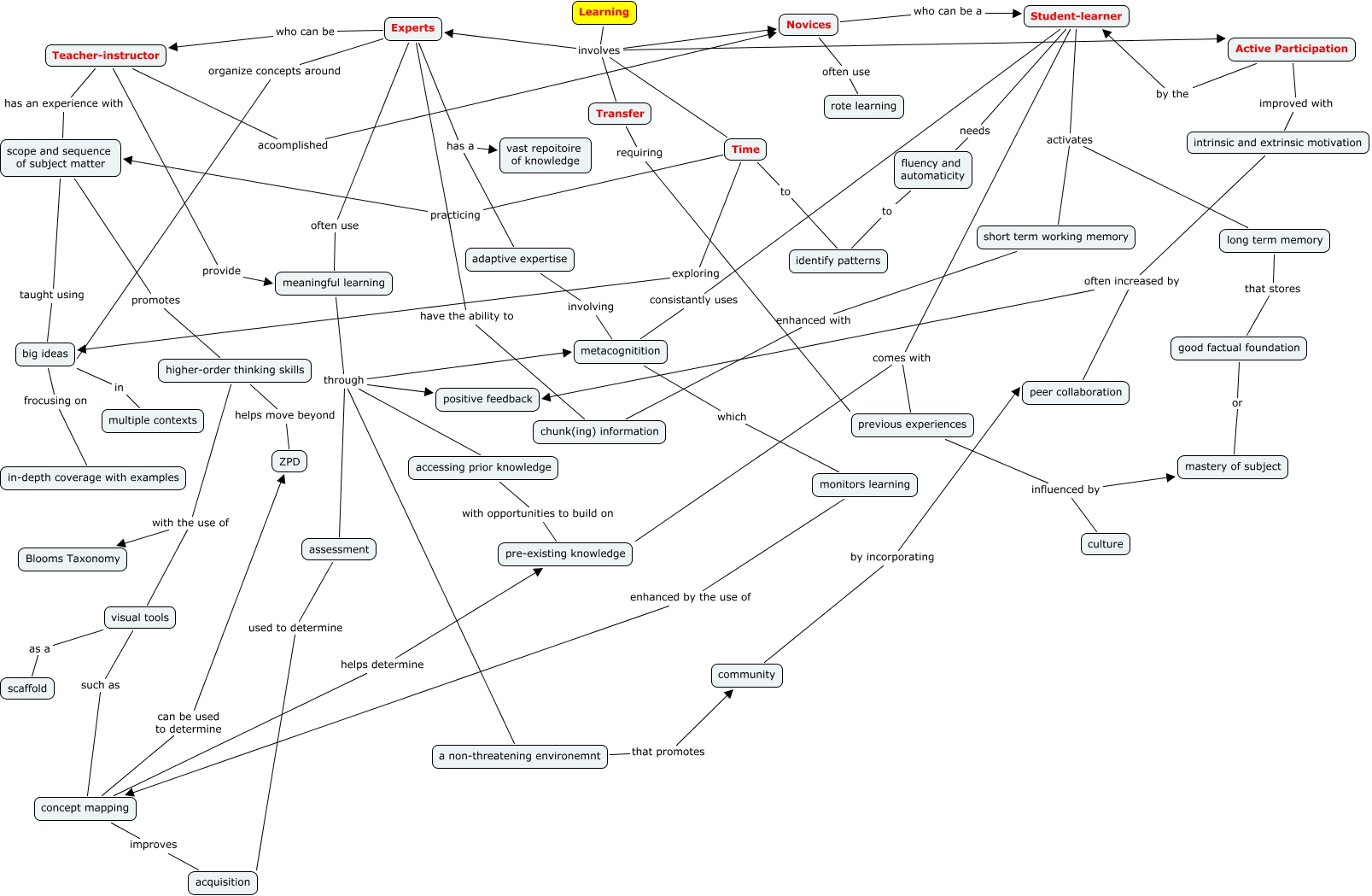 This Concept Map, created with IHMC CmapTools, has information related to: Learning, concept mapping helps determine pre-existing knowledge, visual tools such as concept mapping, accessing prior knowledge with opportunities to build on pre-existing knowledge, adaptive expertise involving metacognitition, big ideas in multiple contexts, meaningful learning through metacognitition, short term working memory enhanced with chunk(ing) information, a non-threatening environemnt that promotes community, scope and sequence of subject matter promotes higher-order thinking skills, monitors learning enhanced by the use of concept mapping, scope and sequence of subject matter taught using big ideas, meaningful learning through assessment, long term memory that stores good factual foundation, Novices often use rote learning, Learning involves Active Participation, metacognitition which monitors learning, concept mapping can be used to determine ZPD, Experts often use meaningful learning, Teacher-instructor has an experience with scope and sequence of subject matter, Time exploring big ideas