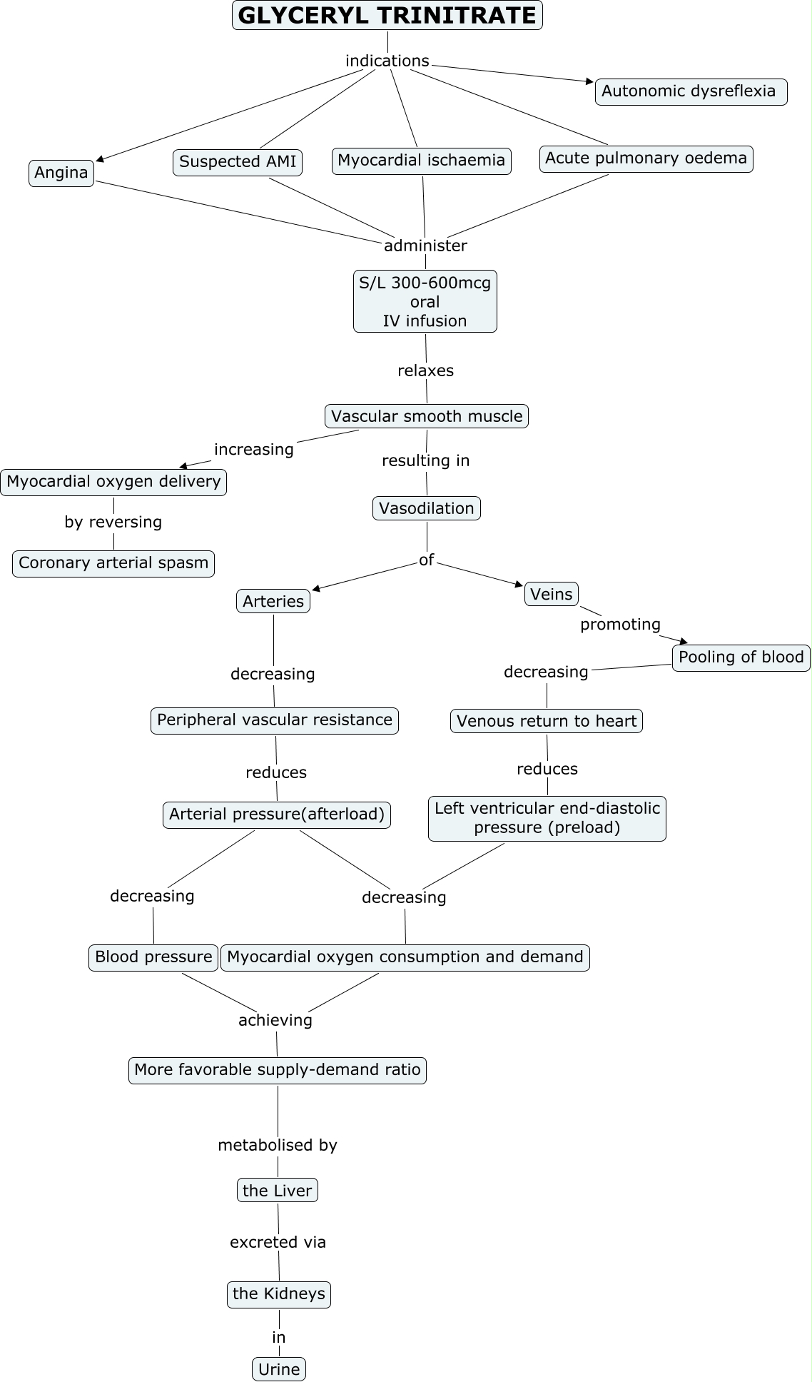 This Concept Map, created with IHMC CmapTools, has information related to: Glyceryl Trinitrate, the Liver excreted via the Kidneys, Suspected AMI administer S/L 300-600mcg oral IV infusion, Myocardial oxygen consumption and demand achieving More favorable supply-demand ratio, GLYCERYL TRINITRATE indications Acute pulmonary oedema, Angina administer S/L 300-600mcg oral IV infusion, Myocardial oxygen delivery by reversing Coronary arterial spasm, GLYCERYL TRINITRATE indications Autonomic dysreflexia, Peripheral vascular resistance reduces Arterial pressure(afterload), Vascular smooth muscle resulting in Vasodilation, Pooling of blood decreasing Venous return to heart, GLYCERYL TRINITRATE indications Suspected AMI, Acute pulmonary oedema administer S/L 300-600mcg oral IV infusion, GLYCERYL TRINITRATE indications Myocardial ischaemia, Left ventricular end-diastolic pressure (preload) decreasing Myocardial oxygen consumption and demand, Blood pressure achieving More favorable supply-demand ratio, Vasodilation of Veins, the Kidneys in Urine, GLYCERYL TRINITRATE indications Angina, Vasodilation of Arteries, Arterial pressure(afterload) decreasing Myocardial oxygen consumption and demand