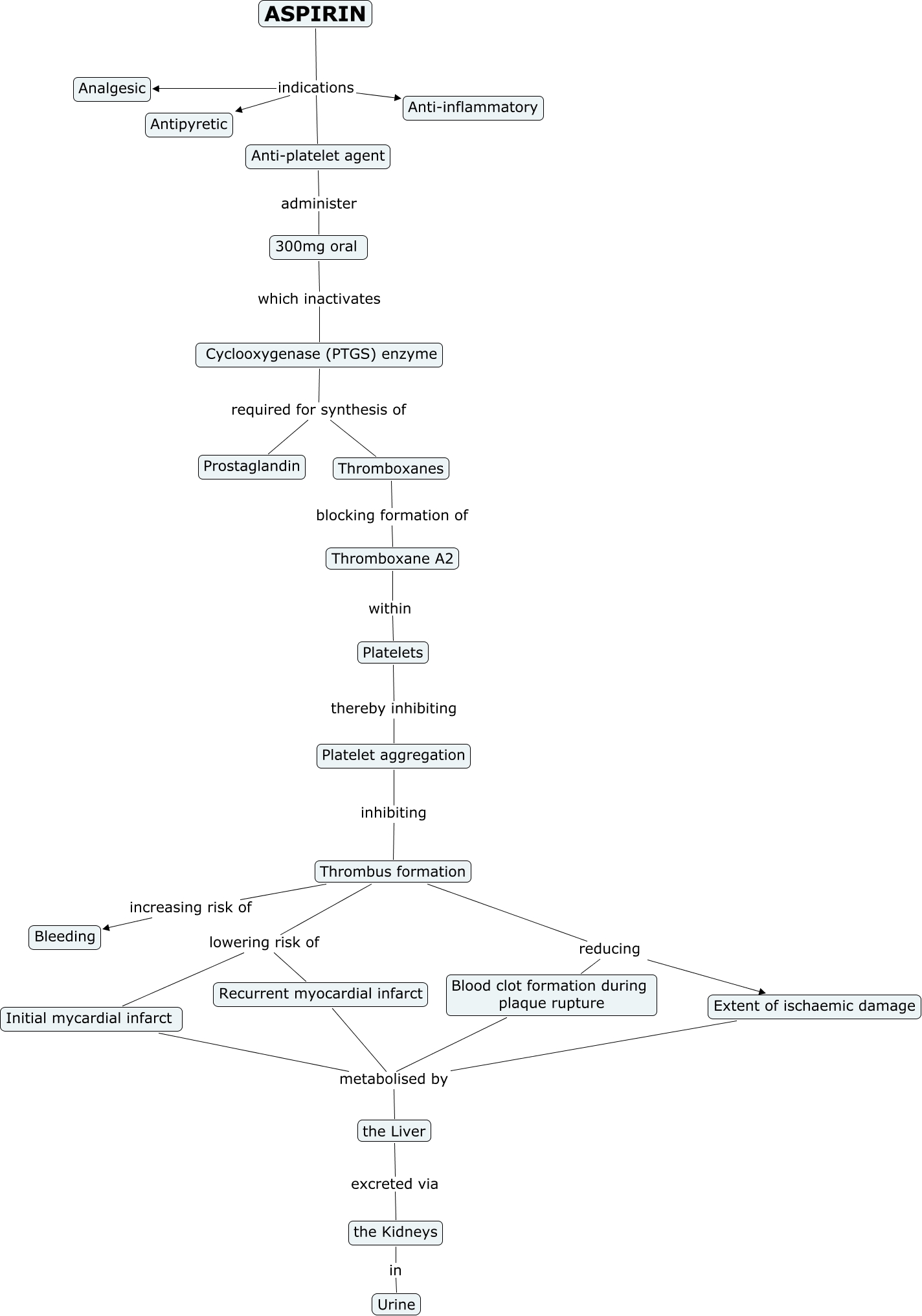This Concept Map, created with IHMC CmapTools, has information related to: Aspirin, the Kidneys in Urine, Thrombus formation lowering risk of Recurrent myocardial infarct, Cyclooxygenase (PTGS) enzyme required for synthesis of Prostaglandin, Initial mycardial infarct metabolised by the Liver, Platelet aggregation inhibiting Thrombus formation, Thromboxane A2 within Platelets, Thrombus formation lowering risk of Initial mycardial infarct, ASPIRIN indications Anti-platelet agent, Thrombus formation reducing Extent of ischaemic damage, ASPIRIN indications Analgesic, Anti-platelet agent administer 300mg oral, Extent of ischaemic damage metabolised by the Liver, the Liver excreted via the Kidneys, Platelets thereby inhibiting Platelet aggregation, Recurrent myocardial infarct metabolised by the Liver, Thromboxanes blocking formation of Thromboxane A2, Thrombus formation increasing risk of Bleeding, ASPIRIN indications Antipyretic, Thrombus formation reducing Blood clot formation during plaque rupture, Cyclooxygenase (PTGS) enzyme required for synthesis of Thromboxanes