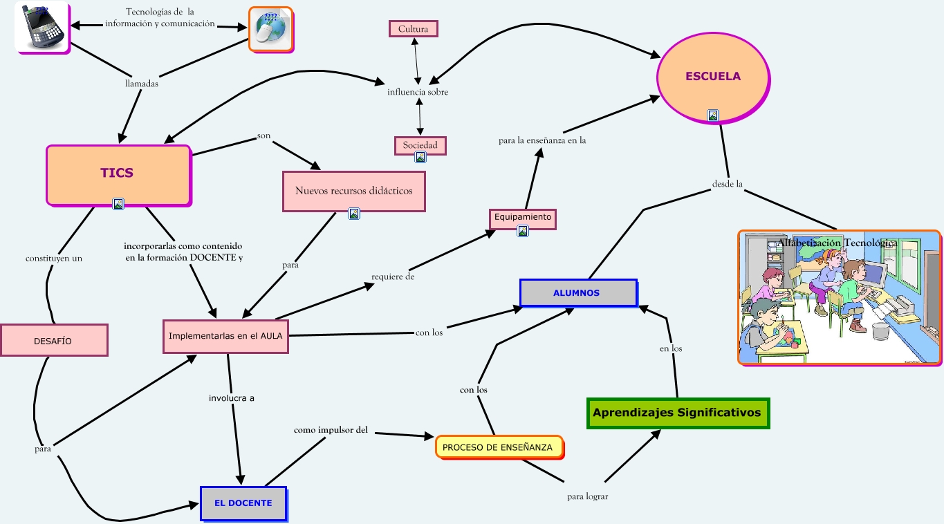 Este Cmap, tiene información relacionada con: tics, Equipamiento para la enseñanza en la ESCUELA, TICS son Nuevos recursos didácticos, ALUMNOS desde la Alfabetización Tecnológica, PROCESO DE ENSEÑANZA para lograr Aprendizajes Significativos, Implementarlas en el AULA involucra a EL DOCENTE, TICS influencia sobre Sociedad, TICS influencia sobre Cultura, EL DOCENTE como impulsor del PROCESO DE ENSEÑANZA, Implementarlas en el AULA con los ALUMNOS, ???? llamadas TICS, TICS incorporarlas como contenido en la formación DOCENTE y Implementarlas en el AULA, Implementarlas en el AULA requiere de Equipamiento, ALUMNOS desde la ESCUELA, Aprendizajes Significativos en los ALUMNOS, TICS constituyen un DESAFÍO, ???? llamadas ????, TICS influencia sobre ESCUELA, Nuevos recursos didácticos para Implementarlas en el AULA, DESAFÍO para Implementarlas en el AULA, PROCESO DE ENSEÑANZA con los ALUMNOS