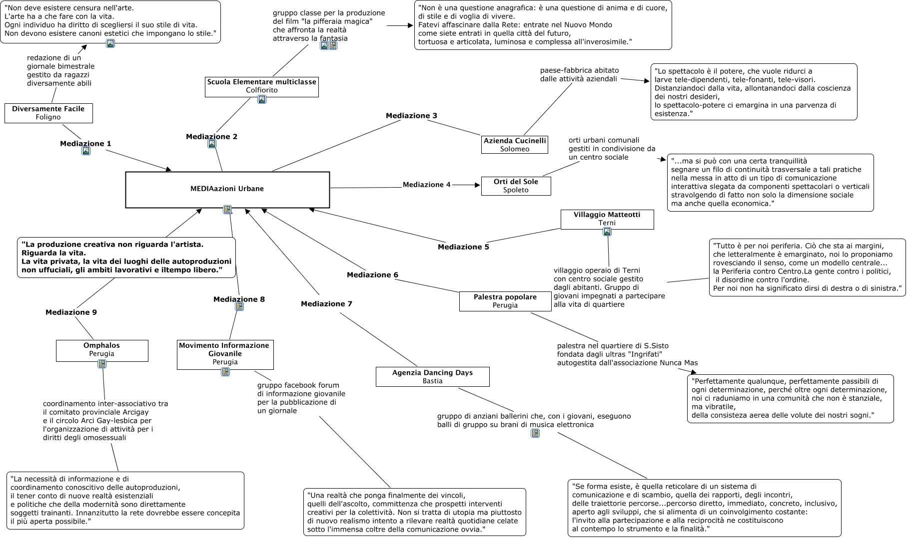 Questa Cmap, creata con IHMC CmapTools, contiene informazioni relative a: MEDIAazioni2, Agenzia Dancing Days Bastia gruppo di anziani ballerini che, con i giovani, eseguono balli di gruppo su brani di musica elettronica "Se forma esiste, è quella reticolare di un sistema di comunicazione e di scambio, quella dei rapporti, degli incontri, delle traiettorie percorse...percorso diretto, immediato, concreto, inclusivo, aperto agli sviluppi, che si alimenta di un coinvolgimento costante: l'invito alla partecipazione e alla reciprocità ne costituiscono al contempo lo strumento e la finalità.", Movimento Informazione Giovanile Perugia gruppo facebook forum di informazione giovanile per la pubblicazione di un giornale "Una realtà che ponga finalmente dei vincoli, quelli dell'ascolto, committenza che prospetti interventi creativi per la colettività. Non si tratta di utopia ma piuttosto di nuovo realismo intento a rilevare realtà quotidiane celate sotto l'immensa coltre della comunicazione ovvia.", Palestra popolare Perugia palestra nel quartiere di S.Sisto fondata dagli ultras "Ingrifati" autogestita dall'associazione Nunca Mas "Perfettamente qualunque, perfettamente passibili di ogni determinazione, perché oltre ogni determinazione, noi ci raduniamo in una comunità che non è stanziale, ma vibratile, della consisteza aerea delle volute dei nostri sogni.", Azienda Cucinelli Solomeo paese-fabbrica abitato dalle attività aziendali "Lo spettacolo è il potere, che vuole ridurci a larve tele-dipendenti, tele-fonanti, tele-visori. Distanziandoci dalla vita, allontanandoci dalla coscienza dei nostri desideri, lo spettacolo-potere ci emargina in una parvenza di esistenza.", Villaggio Matteotti Terni Mediazione 5 MEDIAazioni Urbane, Omphalos Perugia Mediazione 9 MEDIAazioni Urbane, Scuola Elementare multiclasse Colfiorito gruppo classe per la produzione del film "la pifferaia magica" che affronta la realtà attraverso la fantasia "Non è una questione anagrafica: è una questione di anima e di cuore, di stile e di voglia di vivere. Fatevi affascinare dalla Rete: entrate nel Nuovo Mondo come siete entrati in quella città del futuro, tortuosa e articolata, luminosa e complessa all'inverosimile.", Scuola Elementare multiclasse Colfiorito Mediazione 2 MEDIAazioni Urbane, "Tutto è per noi periferia. Ciò che sta ai margini, che letteralmente è emarginato, noi lo proponiamo rovesciando il senso, come un modello centrale... la Periferia contro Centro.La gente contro i politici, il disordine contro l'ordine. Per noi non ha significato dirsi di destra o di sinistra." villaggio operaio di Terni con centro sociale gestito dagli abitanti. Gruppo di giovani impegnati a partecipare alla vita di quartiere Villaggio Matteotti Terni, Diversamente Facile Foligno redazione di un giornale bimestrale gestito da ragazzi diversamente abili "Non deve esistere censura nell'arte. L'arte ha a che fare con la vita. Ogni individuo ha diritto di scegliersi il suo stile di vita. Non devono esistere canoni estetici che impongano lo stile.", Palestra popolare Perugia Mediazione 6 MEDIAazioni Urbane, Diversamente Facile Foligno Mediazione 1 MEDIAazioni Urbane, Azienda Cucinelli Solomeo Mediazione 3 MEDIAazioni Urbane, "La necessità di informazione e di coordinamento conoscitivo delle autoproduzioni, il tener conto di nuove realtà esistenziali e politiche che della modernità sono direttamente soggetti trainanti. Innanzitutto la rete dovrebbe essere concepita il più aperta possibile." coordinamento inter-associativo tra il comitato provinciale Arcigay e il circolo Arci Gay-lesbica per l'organizzazione di attività per i diritti degli omosessuali Omphalos Perugia, MEDIAazioni Urbane Mediazione 4 Orti del Sole Spoleto, Movimento Informazione Giovanile Perugia Mediazione 8 MEDIAazioni Urbane, Orti del Sole Spoleto orti urbani comunali gestiti in condivisione da un centro sociale "...ma si può con una certa tranquillità segnare un filo di continuità trasversale a tali pratiche nella messa in atto di un tipo di comunicazione interattiva slegata da componenti spettacolari o verticali stravolgendo di fatto non solo la dimensione sociale ma anche quella economica.", Agenzia Dancing Days Bastia Mediazione 7 MEDIAazioni Urbane