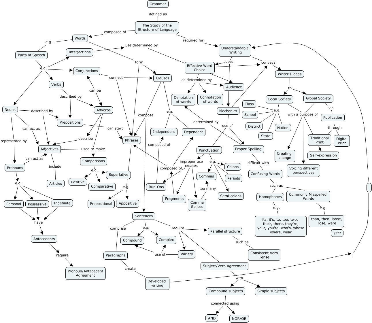 This Concept Map, created with IHMC CmapTools, has information related to: Freshman Grammar Concepts, Parts of Speech e.g. Conjunctions, Nouns described by Adjectives, Adverbs used to make Comparisons, Verbs described by Prepositions, Clauses compose Sentences, Sentences e.g. Compound, Effective Word Choice conveys Writer's ideas, Writer's ideas to Local Society, Words form Clauses, Effective Word Choice as determined by Audience, Interjections use determined by Audience, Variety use of Complex, Run-Ons composed of Independent, Understandable Writing uses Effective Word Choice, Understandable Writing conveys Writer's ideas, Local Society with a purpose of Self-expression, Sentences require Parallel structure, Mechanics conveys Writer's ideas, Comparisons e.g. Superlative, Global Society with a purpose of Voicing different perspectives