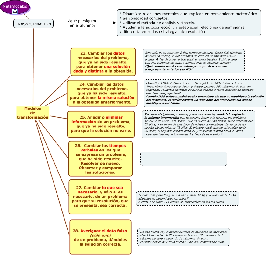 Este Cmap, tiene información relacionada con: transformación, TRASNFORMACIÓN ???? Metamodelos, TRASNFORMACIÓN Modelos de transformación 24. Cambiar los datos necesarios del problema, que ya ha sido resuelto, para obtener la misma solución a la obtenida anteriormente., TRASNFORMACIÓN Modelos de transformación 26. Cambiar los tiempos verbales en los que se expresa un problema, que ha sido resuelto. Resolver de nuevo. Observar y comparar las soluciones., TRASNFORMACIÓN Modelos de transformación 28. Averiguar el dato falso (sólo uno) de un problema, dándoles la solución correcta., TRASNFORMACIÓN ¿qué persiguen en el alumno? * Dinamizar relaciones mentales que implican en pensamiento matemático. * Se consolidad conceptos. * Utilizar el método de análisis y síntesis. * Ayudan a la autocorrección, y establecen relaciones de semejanza y diferencia entre las estrategias de resolución, TRASNFORMACIÓN Modelos de transformación 27. Cambiar lo que sea necesario, y sólo si es necesario, de un problema para que su resolución, que se presenta, sea correcta., TRASNFORMACIÓN Modelos de transformación 23. Cambiar los datos necesarios del problema, que ya ha sido resuelto, para obtener una solución dada y distinta a la obtenida., TRASNFORMACIÓN Modelos de transformación 25. Anadir o eliminar información de un problema, que ya ha sido resuelto, para que la solución no varíe.