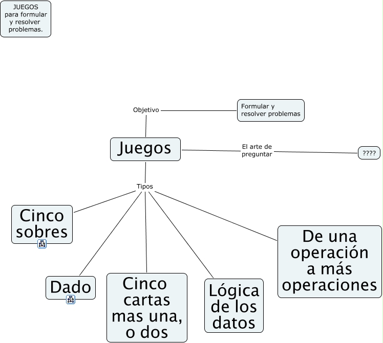 Este Cmap, tiene información relacionada con: juegos, Juegos Objetivo Formular y resolver problemas, Juegos Tipos Cinco sobres, Juegos Tipos Dado, Juegos El arte de preguntar ????, Juegos Tipos Lógica de los datos, Juegos Tipos De una operación a más operaciones, Juegos Tipos Cinco cartas mas una, o dos