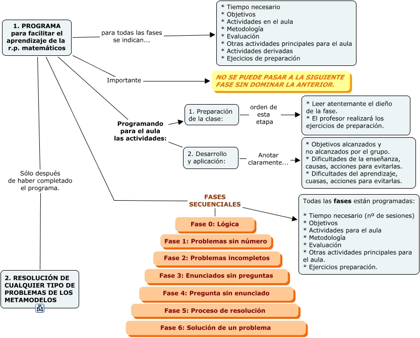 Este Cmap, tiene información relacionada con: fdez bravo, 1. PROGRAMA para facilitar el aprendizaje de la r.p. matemáticos para todas las fases se indican... * Tiempo necesario * Objetivos * Actividades en el aula * Metodología * Evaluación * Otras actividades principales para el aula * Actividades derivadas * Ejecicios de preparación, 1. PROGRAMA para facilitar el aprendizaje de la r.p. matemáticos Programando para el aula las actividades: 1. Preparación de la clase:, 1. PROGRAMA para facilitar el aprendizaje de la r.p. matemáticos FASES SECUENCIALES Todas las fases están programadas: * Tiempo necesario (nº de sesiones) * Objetivos * Actividades para el aula * Metodología * Evaluación * Otras actividades principales para el aula. * Ejercicios preparación., 1. PROGRAMA para facilitar el aprendizaje de la r.p. matemáticos Importante NO SE PUEDE PASAR A LA SIGUIENTE FASE SIN DOMINAR LA ANTERIOR., 1. PROGRAMA para facilitar el aprendizaje de la r.p. matemáticos FASES SECUENCIALES Fase 2: Problemas incompletos, 1. PROGRAMA para facilitar el aprendizaje de la r.p. matemáticos FASES SECUENCIALES Fase 6: Solución de un problema, 1. PROGRAMA para facilitar el aprendizaje de la r.p. matemáticos FASES SECUENCIALES Fase 0: Lógica, 1. PROGRAMA para facilitar el aprendizaje de la r.p. matemáticos Programando para el aula las actividades: 2. Desarrollo y aplicación:, 1. PROGRAMA para facilitar el aprendizaje de la r.p. matemáticos Sólo después de haber completado el programa. 2. RESOLUCIÓN DE CUALQUIER TIPO DE PROBLEMAS DE LOS METAMODELOS, 2. Desarrollo y aplicación: Anotar claramente... * Objetivos alcanzados y no alcanzados por el grupo. * Dificultades de la enseñanza, causas, acciones para evitarlas. * Dificultades del aprendizaje, cuasas, acciones para evitarlas., 1. PROGRAMA para facilitar el aprendizaje de la r.p. matemáticos FASES SECUENCIALES Fase 3: Enunciados sin preguntas, 1. Preparación de la clase: orden de esta etapa * Leer atentemante el dieño de la fase. * El profesor realizará los ejercicios de preparación., 1. PROGRAMA para facilitar el aprendizaje de la r.p. matemáticos FASES SECUENCIALES Fase 4: Pregunta sin enunciado, 1. PROGRAMA para facilitar el aprendizaje de la r.p. matemáticos FASES SECUENCIALES Fase 5: Proceso de resolución