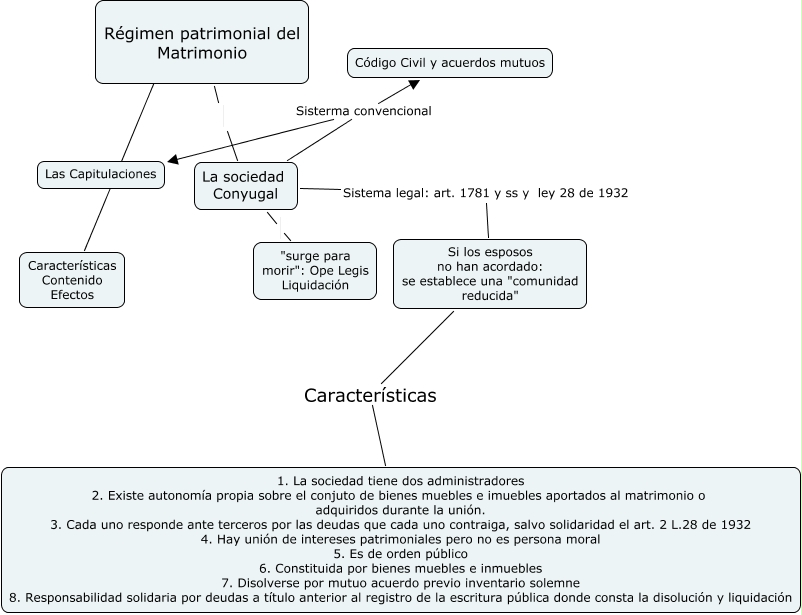 Este Cmap, tiene información relacionada con: regimen patrimonial, Régimen patrimonial del Matrimonio La sociedad Conyugal, Régimen patrimonial del Matrimonio ???? Características Contenido Efectos, La sociedad Conyugal Sistema legal: art. 1781 y ss y ley 28 de 1932 Si los esposos no han acordado: se establece una "comunidad reducida", La sociedad Conyugal Sisterma convencional Las Capitulaciones, Si los esposos no han acordado: se establece una "comunidad reducida" Características 1. La sociedad tiene dos administradores 2. Existe autonomía propia sobre el conjuto de bienes muebles e imuebles aportados al matrimonio o adquiridos durante la unión. 3. Cada uno responde ante terceros por las deudas que cada uno contraiga, salvo solidaridad el art. 2 L.28 de 1932 4. Hay unión de intereses patrimoniales pero no es persona moral 5. Es de orden público 6. Constituida por bienes muebles e inmuebles 7. Disolverse por mutuo acuerdo previo inventario solemne 8. Responsabilidad solidaria por deudas a título anterior al registro de la escritura pública donde consta la disolución y liquidación, La sociedad Conyugal "surge para morir": Ope Legis Liquidación, La sociedad Conyugal Sisterma convencional Código Civil y acuerdos mutuos