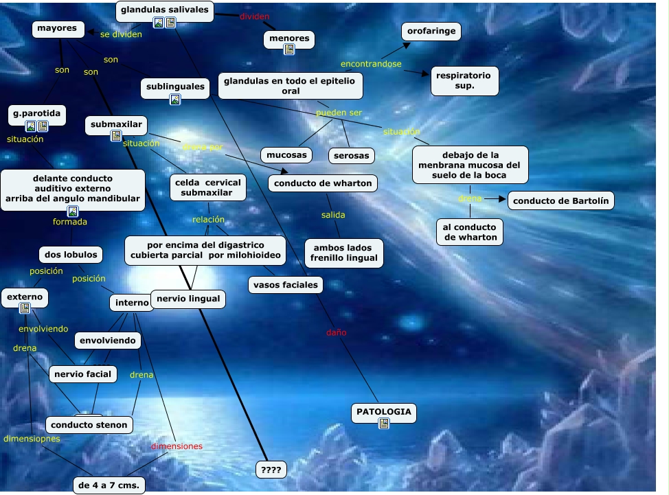 Este Cmap, tiene información relacionada con: glandulas, interno drena conducto stenon, dos lobulos posición externo, celda cervical submaxilar relación nervio lingual, interno dimensiones de 4 a 7 cms., glandulas salivales daño PATOLOGIA, externo envolviendo nervio facial, glandulas en todo el epitelio oral pueden ser serosas, glandulas en todo el epitelio oral encontrandose orofaringe, submaxilar situación celda cervical submaxilar, conducto de wharton salida ambos lados frenillo lingual, externo drena ????, interno ???? nervio facial, glandulas salivales dividen menores, celda cervical submaxilar relación por encima del digastrico cubierta parcial por milohioideo, debajo de la menbrana mucosa del suelo de la boca drena al conducto de wharton, glandulas salivales se dividen mayores, sublinguales situación debajo de la menbrana mucosa del suelo de la boca, glandulas en todo el epitelio oral encontrandose respiratorio sup., celda cervical submaxilar relación vasos faciales, submaxilar drena por conducto de wharton