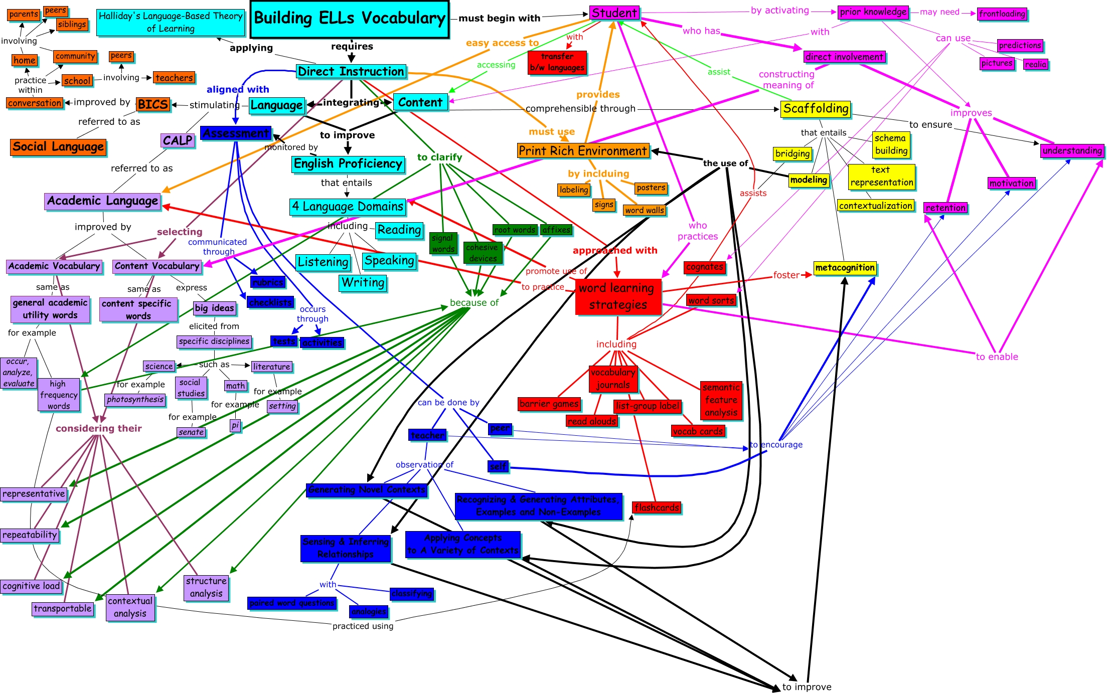 This Concept Map, created with IHMC CmapTools, has information related to: Building ELLs Vocab 2, bridging assists Student, teacher observation of Generating Novel Contexts, Assessment can be done by teacher, direct involvement improves understanding, conversation practice within home, Direct Instruction must use Print Rich Environment, teacher observation of Applying Concepts to A Variety of Contexts, community involving parents, 4 Language Domains including Writing, word learning strategies including barrier games, Direct Instruction approached with word learning strategies, Scaffolding that entails metacognition, direct involvement improves motivation, Academic Vocabulary same as general academic utility words, Assessment communicated through rubrics, Scaffolding that entails contextualization, Sensing & Inferring Relationships with analogies, Content Vocabulary considering their cognitive load, Print Rich Environment by inclduing posters, cohesive devices because of cognitive load