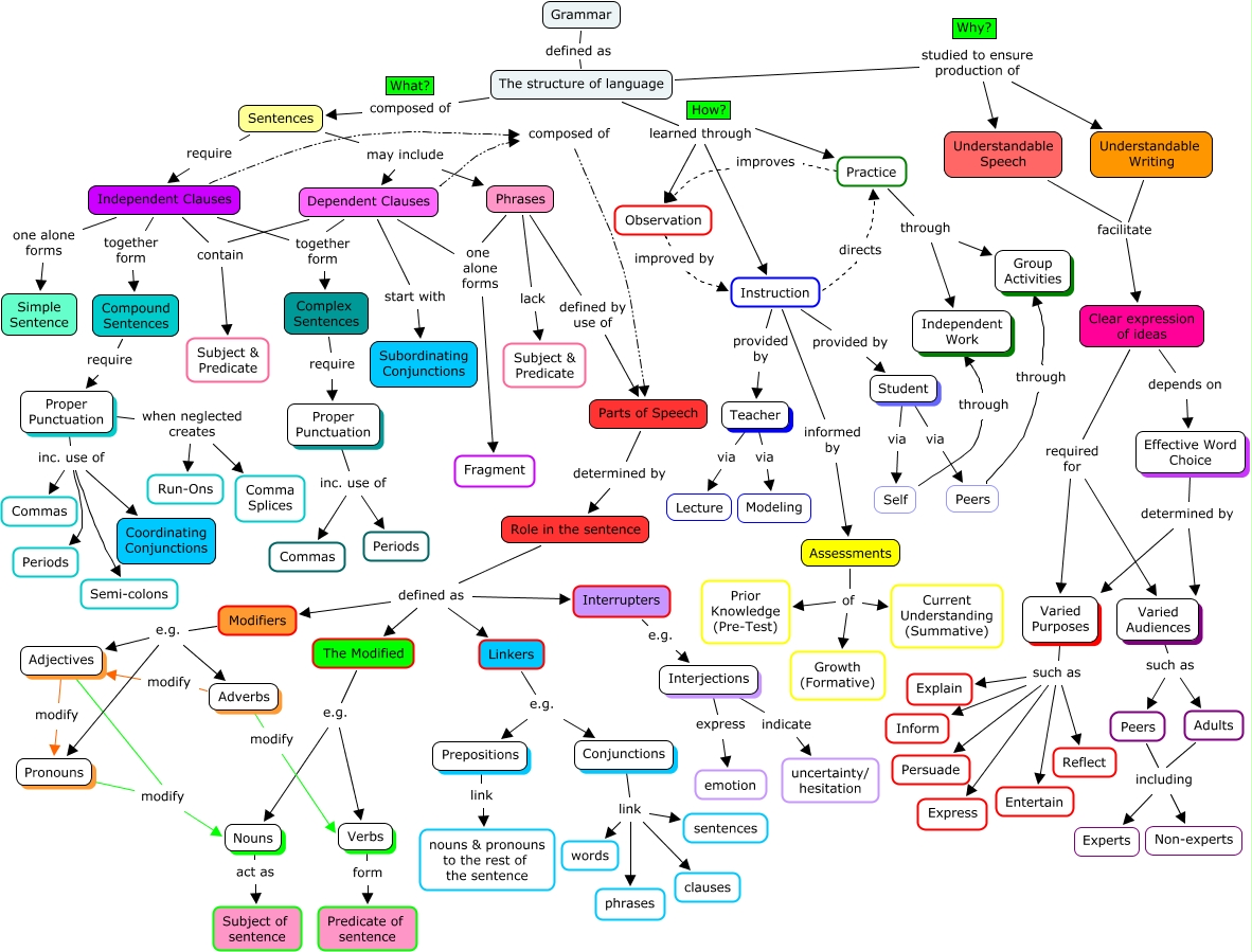 This Concept Map, created with IHMC CmapTools, has information related to: Freshman Grammar Concepts 2.0, Proper Punctuation inc. use of Coordinating Conjunctions, Independent Clauses one alone forms Simple Sentence, Varied Purposes such as Persuade, Linkers e.g. Conjunctions, The structure of language learned through Practice, Peers through Group Activities, Adults including Experts, Peers including Experts, Varied Purposes such as Express, Proper Punctuation inc. use of Periods, The Modified e.g. Verbs, The structure of language composed of Sentences, Sentences may include Phrases, Phrases one alone forms Fragment, Practice through Group Activities, Modifiers e.g. Adverbs, The Modified e.g. Nouns, Proper Punctuation inc. use of Periods, Practice improves Observation, Sentences require Independent Clauses