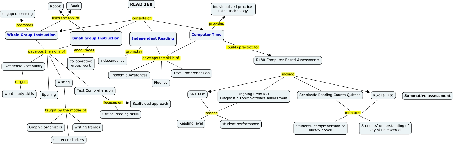 This Concept Map, created with IHMC CmapTools, has information related to: Read180 Draft 2, Whole Group Instruction develops the skills of Spelling, Ongoing Read180 Diagnostic Topic Software Assessment assess student performance, Small Group Instruction develops the skills of Academic Vocabulary, RSkills Test ???? Summative assessment, READ 180 consists of Independent Reading, Computer Time develops the skills of Text Comprehension, Independent Reading develops the skills of Fluency, Whole Group Instruction develops the skills of Writing, Computer Time develops the skills of Phonemic Awareness, READ 180 consists of Small Group Instruction, Academic Vocabulary targets word study skills, Small Group Instruction encourages collaborative group work, Whole Group Instruction develops the skills of Academic Vocabulary, READ 180 consists of Whole Group Instruction, Whole Group Instruction develops the skills of Text Comprehension, Computer Time builds practice for R180 Computer-Based Assessments, Small Group Instruction develops the skills of Text Comprehension, Writing taught by the modes of Graphic organizers, Writing taught by the modes of sentence starters, Whole Group Instruction uses the tool of Rbook