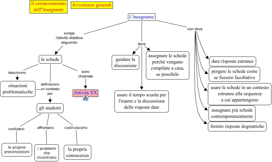 Questa Cmap, creata con IHMC CmapTools, contiene informazioni relative a: Avvertenze generali, L'insegnante non deve porgere le schede come se fossero facoltative, L'insegnante deve usare il tempo scuola per l'esame e la discussione delle risposte date, L'insegnante svolge l'attività didattica seguendo le schede, le schede definiscono un contesto per gli studenti, gli studenti affrontano i problemi che incontrano, le schede descrivono situazioni problematicche, L'insegnante deve assegnare le schede perchè vengano compilate a casa, se possibile, situazioni problematicche definiscono un contesto per gli studenti, L'insegnante deve guidare la discussione, gli studenti costruiscono la propria conoscenza, L'insegnante non deve usare le schede in un contesto estraneo alla sequenza a cui appartengono, le schede sono chiamate Attività XX, gli studenti confutano le proprie preconcezioni, L'insegnante non deve assegnare più schede contemporaneamente, L'insegnante non deve dare risposte estranee, L'insegnante non deve fornire risposte dogmatiche