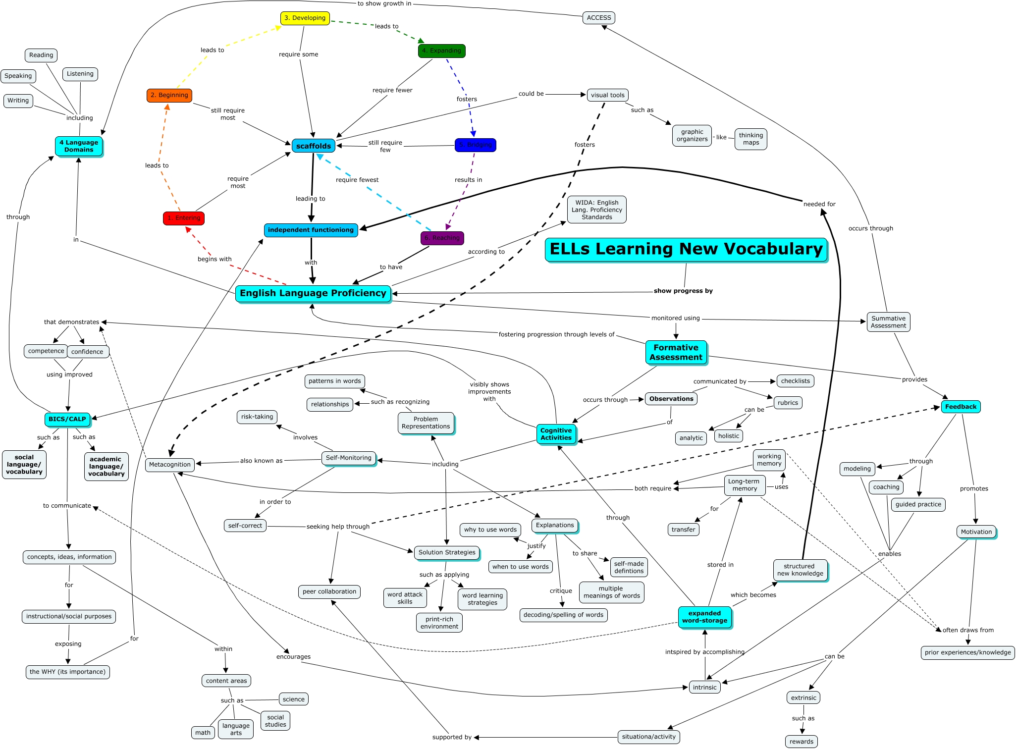 This Concept Map, created with IHMC CmapTools, has information related to: ELLs Progress in Learning Vocabulary 2, Long-term memory both require Metacognition, Self-Monitoring involves risk-taking, English Language Proficiency in 4 Language Domains, Feedback through modeling, rubrics can be holistic, Cognitive Activities including Self-Monitoring, scaffolds leading to independent functioniong, Problem Representations such as recognizing patterns in words, visual tools fosters Metacognition, Feedback through guided practice, Solution Strategies such as applying word attack skills, 3. Developing leads to 4. Expanding, 4 Language Domains including Reading, Explanations critique decoding/spelling of words, working memory both require Metacognition, expanded word-storage to communicate concepts, ideas, information, Cognitive Activities including Solution Strategies, 4 Language Domains including Listening, 2. Beginning still require most scaffolds, 6. Reaching to have English Language Proficiency