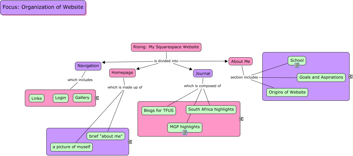 This Concept Map, created with IHMC CmapTools, has information related to: AfricaliWebsite, About Me section includes Goals and Aspirations, Homepage which is made up of brief "about me", Rising: My Squarespace Website is divided into About Me, About Me section includes Origins of Website, Navigation which includes sections, Rising: My Squarespace Website is divided into Navigation, Journal which is composed of South Africa highlights, Homepage which is made up of a picture of myself, Rising: My Squarespace Website is divided into Homepage, Journal which is composed of Blogs for TFUS, Journal which is composed of MGP highlights, Rising: My Squarespace Website is divided into Journal, About Me section includes School