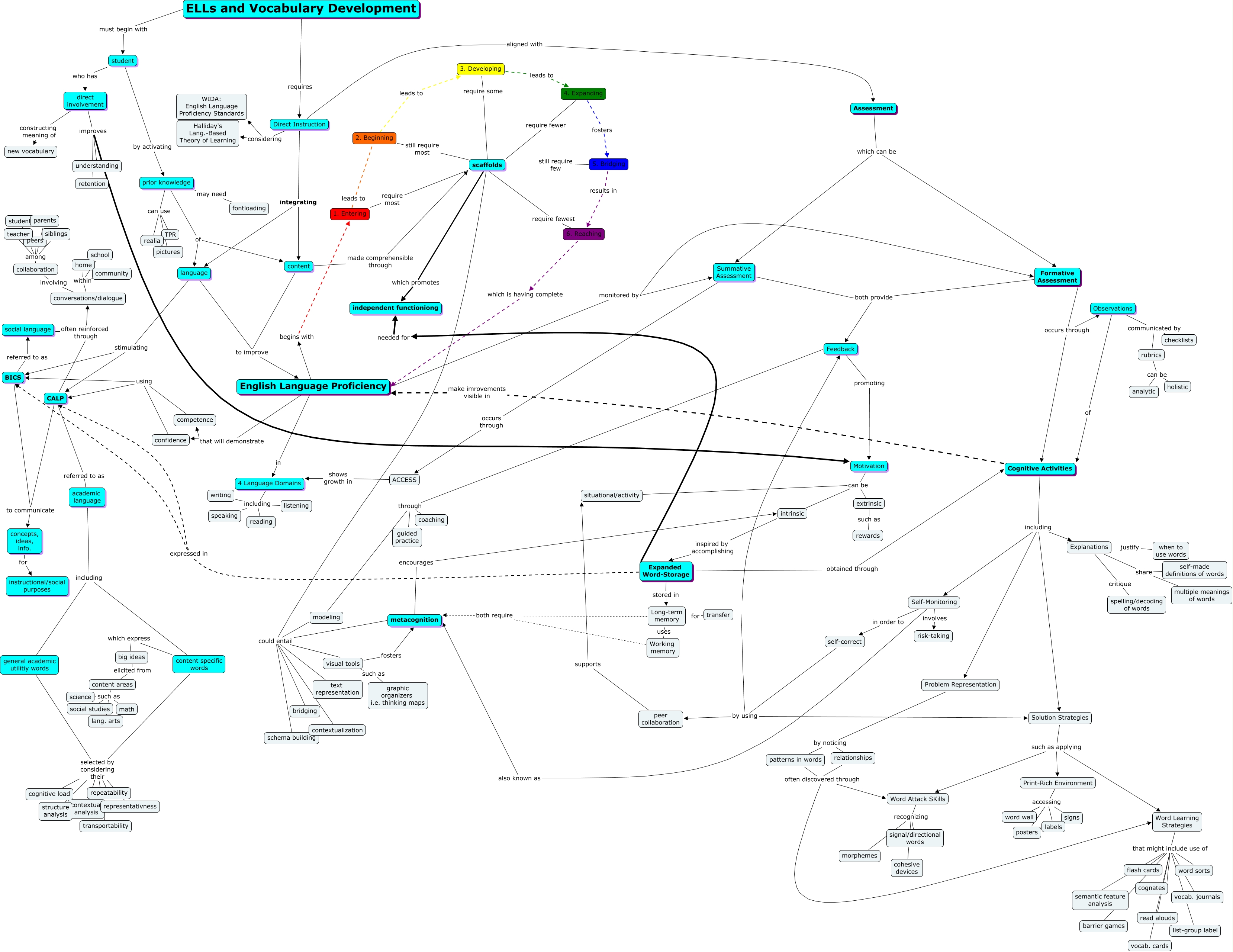 This Concept Map, created with IHMC CmapTools, has information related to: Integrated Concept Map on ELLs and Vocabulary, visual tools such as graphic organizers i.e. thinking maps, 3. Developing require some scaffolds, Problem Representation by noticing patterns in words, language stimulating CALP, general academic utilitiy words selected by considering their repeatability, conversations/dialogue involving collaboration, direct involvement constructing meaning of new vocabulary, Problem Representation by noticing relationships, general academic utilitiy words selected by considering their structure analysis, Explanations share multiple meanings of words, ACCESS shows growth in 4 Language Domains, collaboration among siblings, 5. Bridging still require few scaffolds, Word Learning Strategies that might include use of word sorts, 2. Beginning leads to 3. Developing, confidence using CALP, scaffolds which promotes independent functioniong, peer collaboration supports situational/activity, 4 Language Domains including listening, rubrics can be holistic