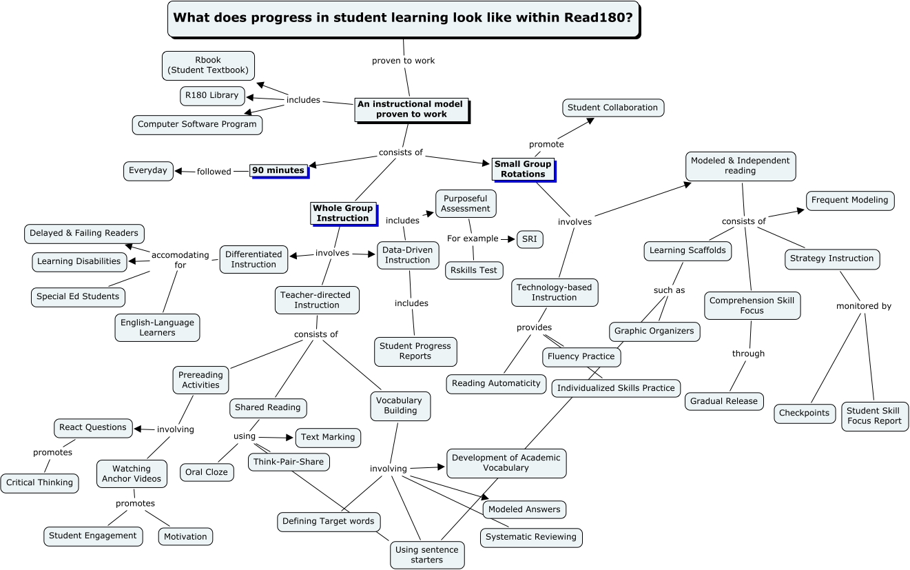 This Concept Map, created with IHMC CmapTools, has information related to: Learning Map - Read180 Draft 2, Differentiated Instruction accomodating for Delayed & Failing Readers, Shared Reading using Using sentence starters, Watching Anchor Videos promotes Student Engagement, Small Group Rotations involves Modeled & Independent reading, Technology-based Instruction provides Reading Automaticity, Vocabulary Building involving Modeled Answers, Whole Group Instruction involves Teacher-directed Instruction, An instructional model proven to work includes Rbook (Student Textbook), Comprehension Skill Focus through Gradual Release, Vocabulary Building involving Development of Academic Vocabulary, Data-Driven Instruction includes Student Progress Reports, Technology-based Instruction provides Fluency Practice, Learning Scaffolds such as Graphic Organizers, Modeled & Independent reading consists of Learning Scaffolds, An instructional model proven to work consists of Small Group Rotations, React Questions promotes Critical Thinking, Small Group Rotations promote Student Collaboration, Differentiated Instruction accomodating for Learning Disabilities, Watching Anchor Videos promotes Motivation, Strategy Instruction monitored by Student Skill Focus Report