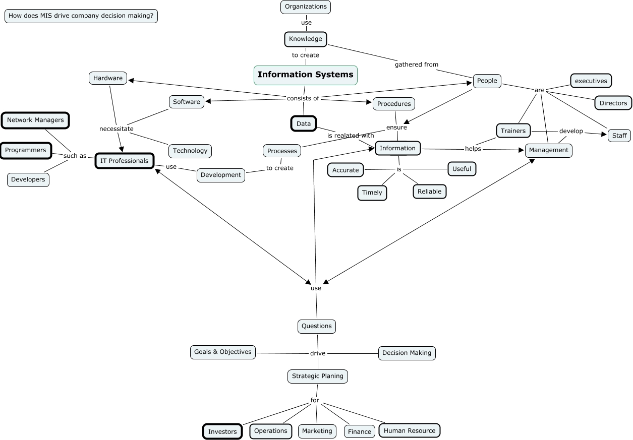This Concept Map, created with IHMC CmapTools, has information related to: Information System, Data is realated with Information, Trainers are executives, Knowledge to create Information Systems, Information Systems consists of People, People are executives, Questions use IT Professionals, Trainers develop Staff, Strategic Planing for Operations, Trainers helps Management, Strategic Planing for Human Resource, Strategic Planing for Marketing, Questions drive Goals & Objectives, Reliable is Timely, Directors are executives, Technology necessitate IT Professionals, Management develop Staff, Questions use Information, Information Systems consists of Software, Information helps Management, Questions drive Decision Making