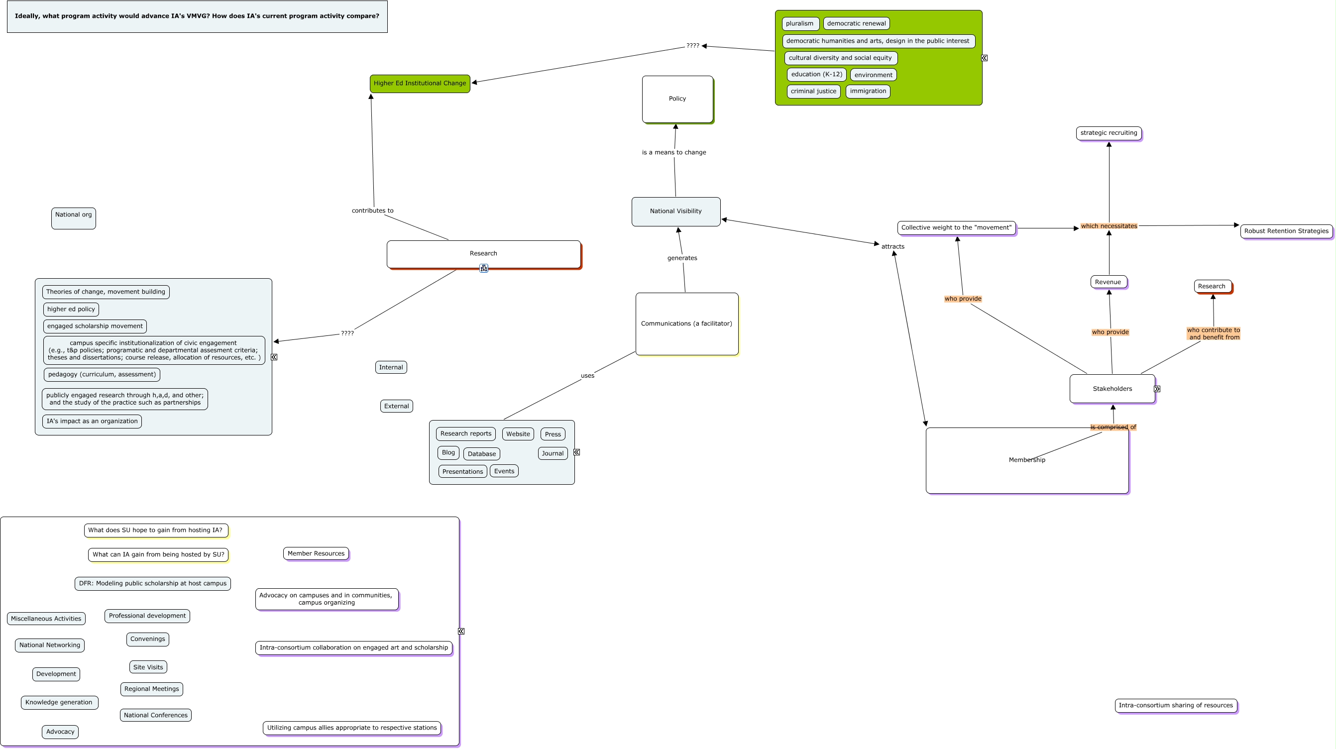 This Concept Map, created with IHMC CmapTools, has information related to: IA's Research, Membership, and Communications, Membership attracts National Visibility, Research contributes to Higher Ed Institutional Change, Collective weight to the "movement" which necessitates strategic recruiting, Revenue which necessitates Robust Retention Strategies, Stakeholders who provide Collective weight to the "movement", Stakeholders who provide Revenue, Improving communities, solving real-world problems ???? Higher Ed Institutional Change, Research ???? Typology, Communications (a facilitator) generates National Visibility, Revenue which necessitates strategic recruiting, Membership is comprised of Stakeholders, National Visibility is a means to change Policy, Communications (a facilitator) uses Tools, Collective weight to the "movement" which necessitates Robust Retention Strategies, Stakeholders who contribute to and benefit from Research