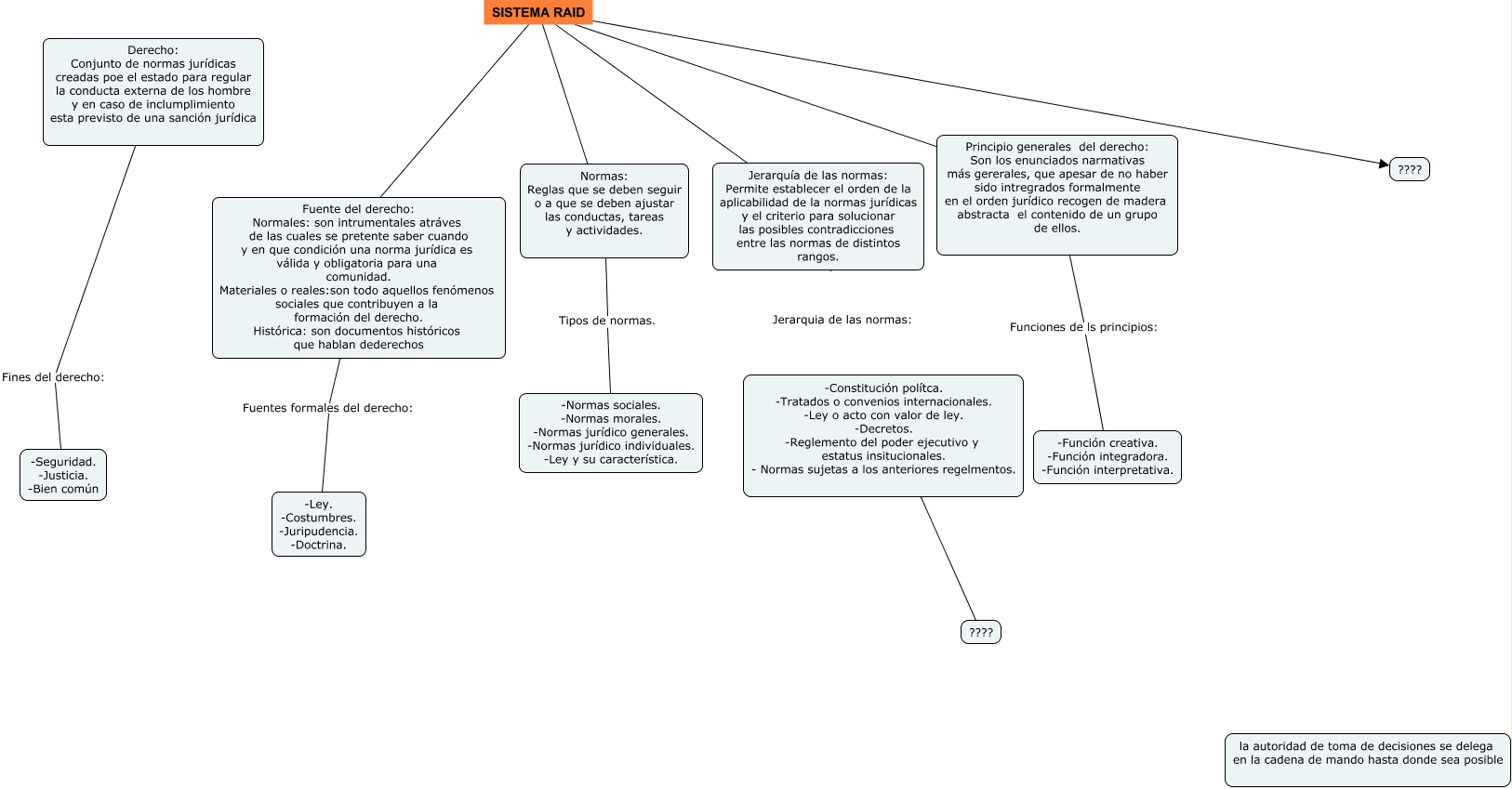 Este Cmap, tiene información relacionada con: Sin Título 2, SISTEMA RAID ???? Jerarquía de las normas: Permite establecer el orden de la aplicabilidad de la normas jurídicas y el criterio para solucionar las posibles contradicciones entre las normas de distintos rangos., Jerarquía de las normas: Permite establecer el orden de la aplicabilidad de la normas jurídicas y el criterio para solucionar las posibles contradicciones entre las normas de distintos rangos. Jerarquia de las normas: ????, Fuente del derecho: Normales: son intrumentales atráves de las cuales se pretente saber cuando y en que condición una norma jurídica es válida y obligatoria para una comunidad. Materiales o reales:son todo aquellos fenómenos sociales que contribuyen a la formación del derecho. Histórica: son documentos históricos que hablan dederechos Fuentes formales del derecho: -Ley. -Costumbres. -Juripudencia. -Doctrina., Derecho: Conjunto de normas jurídicas creadas poe el estado para regular la conducta externa de los hombre y en caso de inclumplimiento esta previsto de una sanción jurídica Fines del derecho: -Seguridad. -Justicia. -Bien común, Jerarquía de las normas: Permite establecer el orden de la aplicabilidad de la normas jurídicas y el criterio para solucionar las posibles contradicciones entre las normas de distintos rangos. Jerarquia de las normas: -Constitución polítca. -Tratados o convenios internacionales. -Ley o acto con valor de ley. -Decretos. -Reglemento del poder ejecutivo y estatus insitucionales. - Normas sujetas a los anteriores regelmentos., SISTEMA RAID ???? Normas: Reglas que se deben seguir o a que se deben ajustar las conductas, tareas y actividades., SISTEMA RAID ???? Fuente del derecho: Normales: son intrumentales atráves de las cuales se pretente saber cuando y en que condición una norma jurídica es válida y obligatoria para una comunidad. Materiales o reales:son todo aquellos fenómenos sociales que contribuyen a la formación del derecho. Histórica: son documentos históricos que hablan dederechos, SISTEMA RAID ???? ????, Principio generales del derecho: Son los enunciados narmativas más gererales, que apesar de no haber sido intregrados formalmente en el orden jurídico recogen de madera abstracta el contenido de un grupo de ellos. Funciones de ls principios: -Función creativa. -Función integradora. -Función interpretativa., SISTEMA RAID Pric Principio generales del derecho: Son los enunciados narmativas más gererales, que apesar de no haber sido intregrados formalmente en el orden jurídico recogen de madera abstracta el contenido de un grupo de ellos., Normas: Reglas que se deben seguir o a que se deben ajustar las conductas, tareas y actividades. Tipos de normas. -Normas sociales. -Normas morales. -Normas jurídico generales. -Normas jurídico individuales. -Ley y su característica.