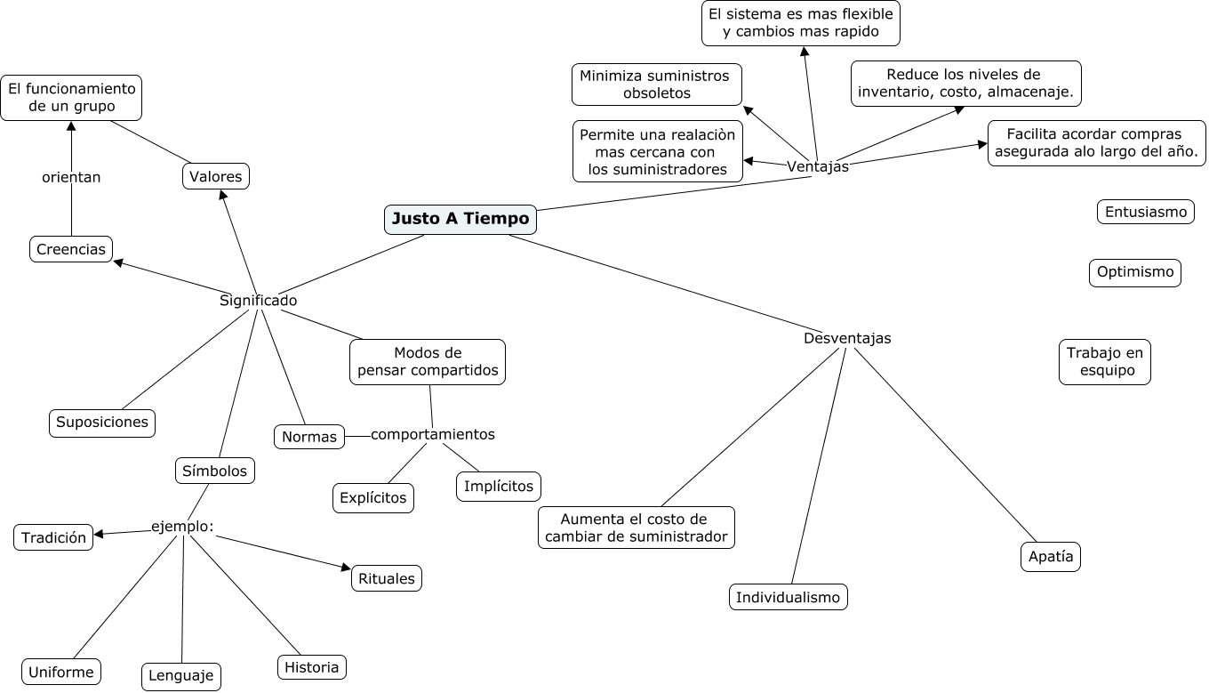 This Concept Map, created with IHMC CmapTools, has information related to: maestria, Justo A Tiempo Ventajas El sistema es mas flexible y cambios mas rapido, Normas comportamientos Implícitos, Símbolos ejemplo: Uniforme, Símbolos ejemplo: Lenguaje, Justo A Tiempo Significado Suposiciones, Creencias orientan El funcionamiento de un grupo, Símbolos ejemplo: Historia, Justo A Tiempo Ventajas Minimiza suministros obsoletos, Justo A Tiempo Desventajas Apatía, Justo A Tiempo Desventajas Individualismo, Símbolos ejemplo: Rituales, Justo A Tiempo Ventajas Facilita acordar compras asegurada alo largo del año., Justo A Tiempo Significado Símbolos, Justo A Tiempo Significado Creencias, Símbolos ejemplo: Tradición, Justo A Tiempo Ventajas Permite una realaciòn mas cercana con los suministradores, Normas comportamientos Explícitos, Justo A Tiempo Significado Modos de pensar compartidos, Modos de pensar compartidos comportamientos Explícitos, Justo A Tiempo Ventajas Reduce los niveles de inventario, costo, almacenaje.